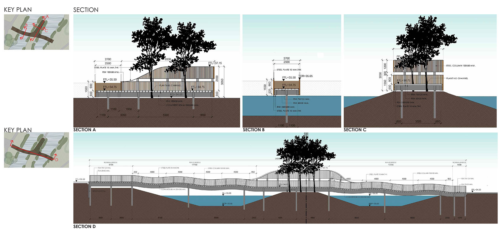 羽翼橋主要采用三種材料:鋼筋混凝土作為基礎(chǔ)和支柱,黑鋼用作橋面結(jié)構(gòu),風(fēng)化的木材用作地板和扶手。由于周圍景觀會受到建造活動的影響,因此設(shè)計施工過程需要與泰國鳥類保護委員會進行緊密合作和協(xié)商,以保證園中動物可以有適宜的棲身之所,沿河堤岸的傾斜坡度能提供庇護和攝食,種植植物的多樣性既保護了土壤又吸引昆蟲。至此,項目離最終完成僅需要適當?shù)难b飾性指示牌。盡管該橋的目的是連接兩座公園并吸引更多來訪者,但只有時間才能檢驗這種連接公共空間的形式是否是一次成功的嘗試,以及未來是否可以借鑒這種直接的解決方式。