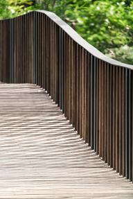 該橋跨越小河,位于Queen公園中軸線北部尾端。它彎曲著穿越茂密樹林,最終降落到2米以下的 Rotfai 公園平面。羽翼橋的立面波動極其緩和以適應(yīng)院內(nèi)不同的高度差。其中部切面橫臥在河堤之上,在繁茂的樹冠之下,彎曲圍合出一處庇護之所。而此處的半實心的木質(zhì)扶手欄桿圍合出一個隱蔽的區(qū)域,成為鳥類的活動區(qū)域?!坝鹨怼钡拿衷醋杂谒陨淼男螒B(tài),也來源于它所處的地點。這個名字充分反映了它作為鳥類棲息地的功能及重要性,也展現(xiàn)了生物多樣性與城市環(huán)境和諧共存的多種可能。
