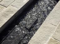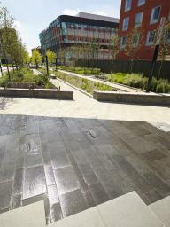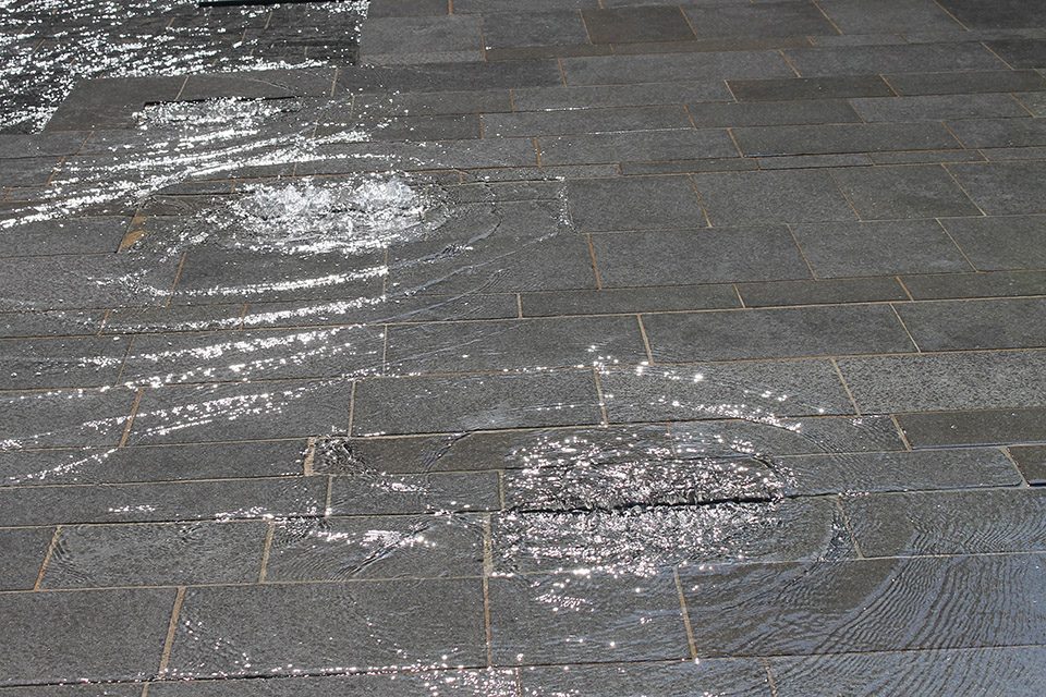35米長(zhǎng)的雨水池覆蓋了公園一半的陸地平面,與環(huán)繞著的多種綠色植物一起過(guò)濾路面的病菌和有害化學(xué)物質(zhì)。此外,該雨水池還讓環(huán)坐在周?chē)挠稳双@得更親密怡人的休閑體驗(yàn)。水是該空間重要的元素之一。18世紀(jì)時(shí)期,這里曾從相鄰河流引入水源來(lái)為附近的工廠提供動(dòng)力。該公園設(shè)計(jì)受Malham Cove的River Aire河流啟發(fā),公園平面被打造成如階梯狀的河道,公園地表以大量石灰?guī)r鋪面,這些石灰?guī)r表面散布一些如同被水流勾勒數(shù)千年的地表裂縫。Sovereign Square公園的水系就是這樣從地面上的裂縫中涌出,順著地勢(shì)向另一個(gè)方向流去,生動(dòng)而震撼。這并不是什么經(jīng)過(guò)精心設(shè)計(jì)的地面噴泉,而是一種近乎真實(shí)的自然現(xiàn)象。這個(gè)獨(dú)特的設(shè)計(jì)不僅吸引了許多小朋友,也讓許多成年人驚訝不已。