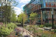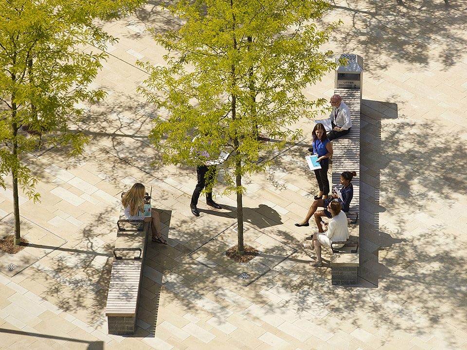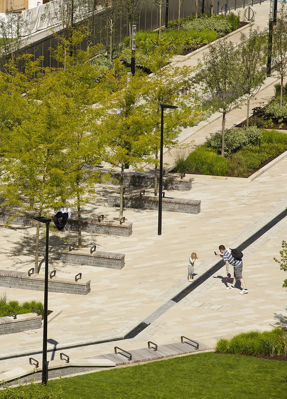 該公共空間沿兩棟辦公大樓而設(shè),成為城市使用者及城市所有者的必經(jīng)之地。值得一提的是,利茲市的城市規(guī)劃理念為“將城市塑造成為適宜兒童居住的城市”,而Sovereign Square項(xiàng)目恰好幫助實(shí)現(xiàn)了該愿景。Sovereign Square是一處親近自然的豐富空間,吸引著人們前往。50棵繁茂的大樹(shù)沿中心綠萍環(huán)繞排開(kāi)。植物的多樣性混合保證了環(huán)境中的花季長(zhǎng)度,從早春到晚秋,該公園都是都市生活的怡人之所。