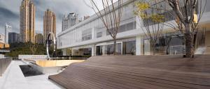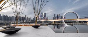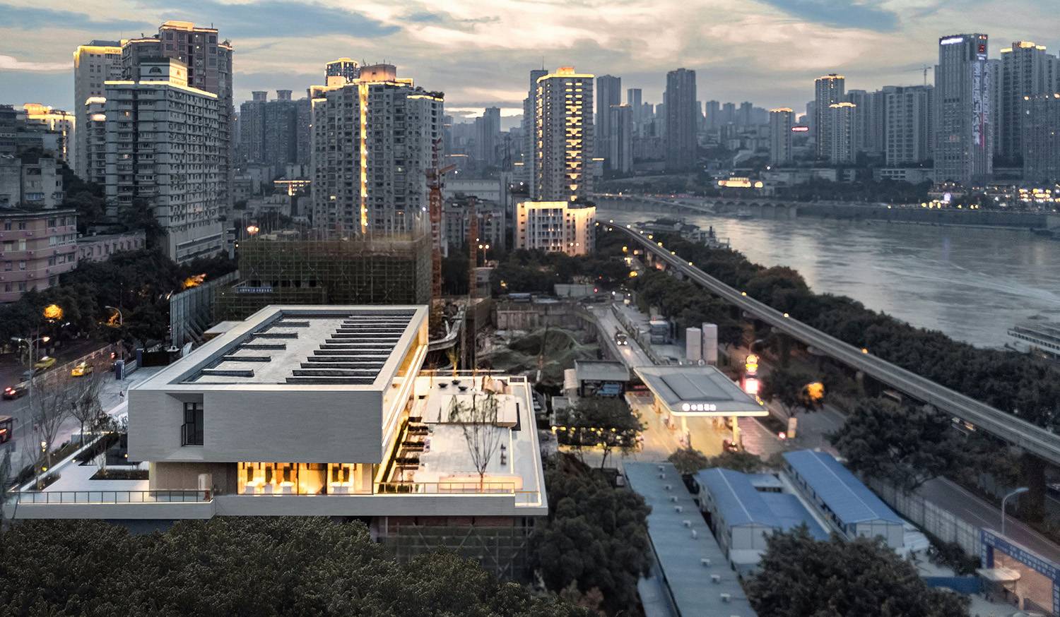 該項目位于重慶嘉陵江畔,是兼具濃郁巴蜀文化、市井風韻與當代工業(yè)文明的復合城市。多元對立的悖論,異質沖突的張力,在經過歷史風雨和市民生活的洗禮,反而成就了山城獨有的地緣風貌。在本案的空間表達中,可感受到復雜與極簡的形態(tài)思考,包容和留白的思辨主張。