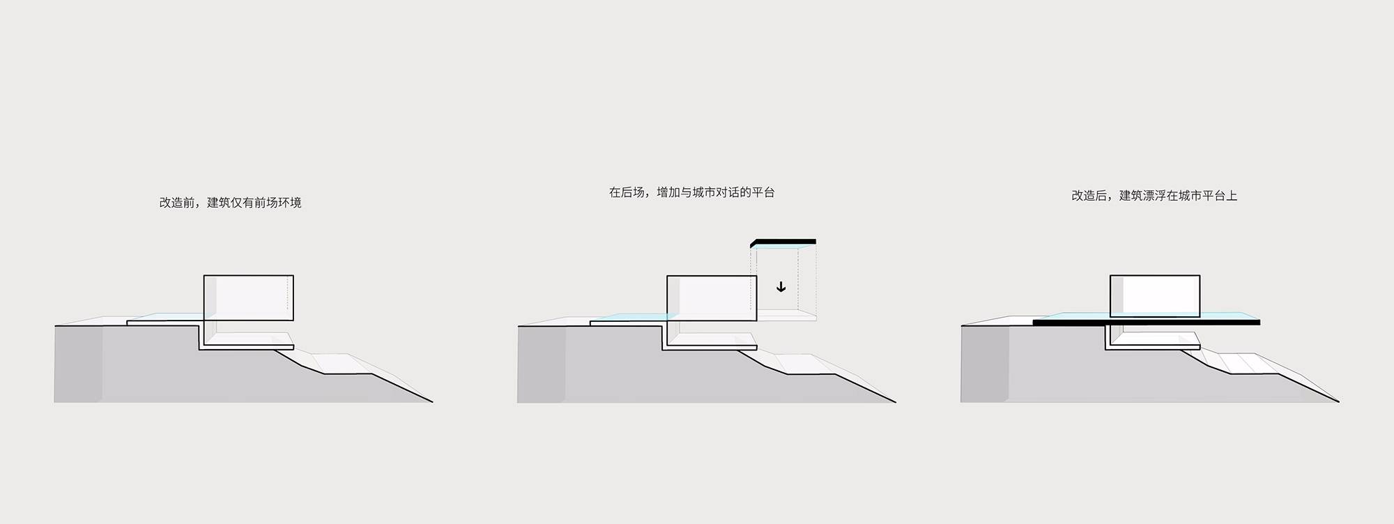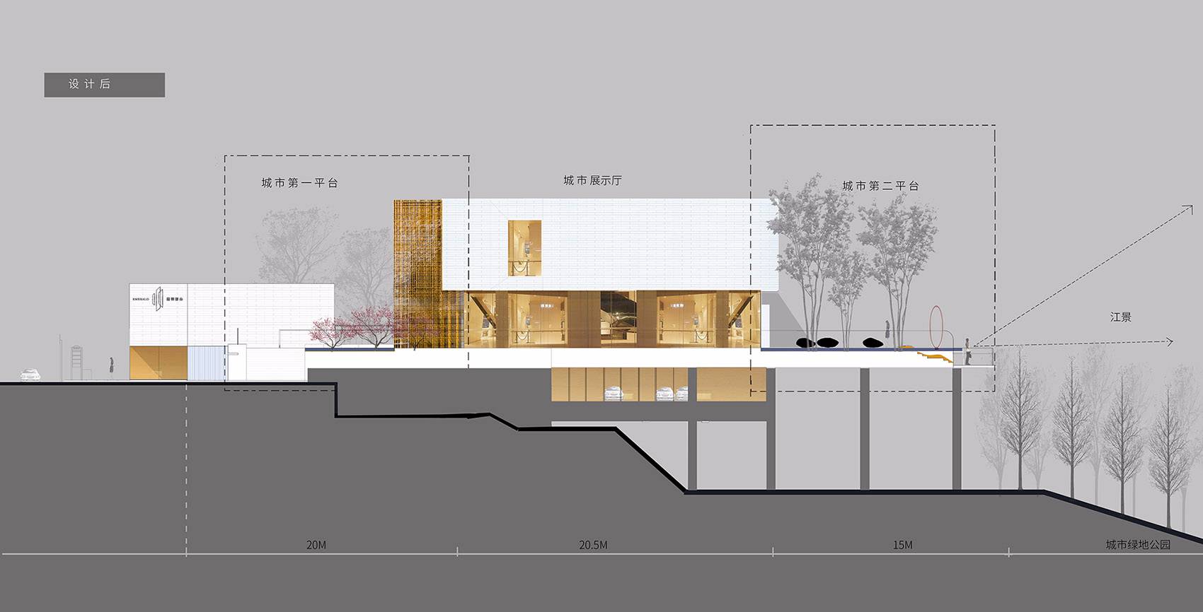 設計伊始,現(xiàn)場止有一個建筑結構前約千平不足的小廣場,依現(xiàn)代園林的體驗尺度自然是局促的,然而,倘若只刻畫一個華麗的入口抑或是塑造一個充滿奢欲的形象,這顯然也是綽綽盈余的。當緩步走進建筑結構內部,其背后漸然拉開徐徐的全景都市天際,是舒闊情志的澄徹心脾。念于此,基于斯,我們傾向以「增加一個外挑的后場平臺」來重構這個場地的澄明畫境。