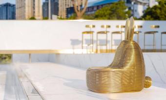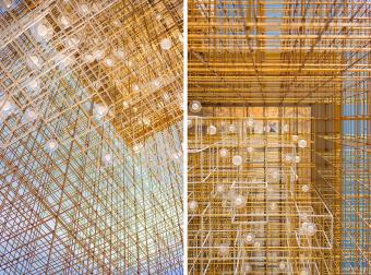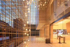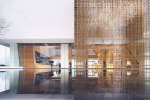 從迎賓式水簾到靜謐水景,拾階、平橋心境也越來越明亮。體驗中心入口,一個金屬格子裝置門,若隱若現(xiàn)地漫瀉下來,形成藝術與時空的另外一種致敬。金格裝置經由系列 300X300 的立方體迭接而成,銅管因排布密度差異,而呈現(xiàn)形態(tài)迥異的通透與多變,是構成韻律幻像與氣息深邃的動因。金格內部,隱現(xiàn)的「生命之樹」與近 300 顆光子的排布控制,是折射生命呼吸與潛滋暗長的發(fā)生關鍵。