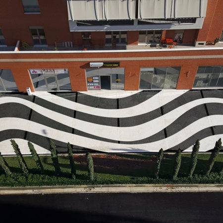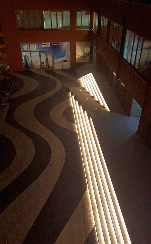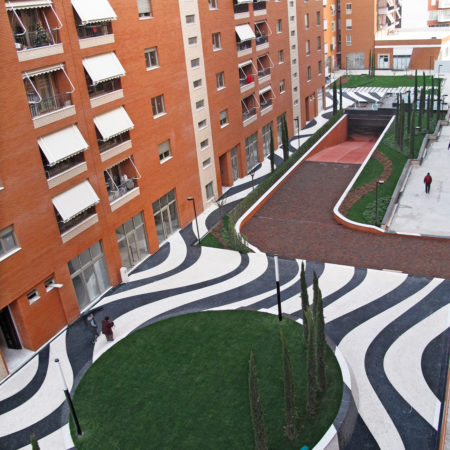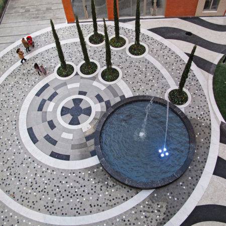 鋪裝設(shè)計選擇了統(tǒng)一的規(guī)劃方案,與建筑物的明亮色彩相呼應(yīng)。兩種顏色的馬賽克在整個地區(qū)和諧地流動著,“擁抱”了整個空間的每個角落。
