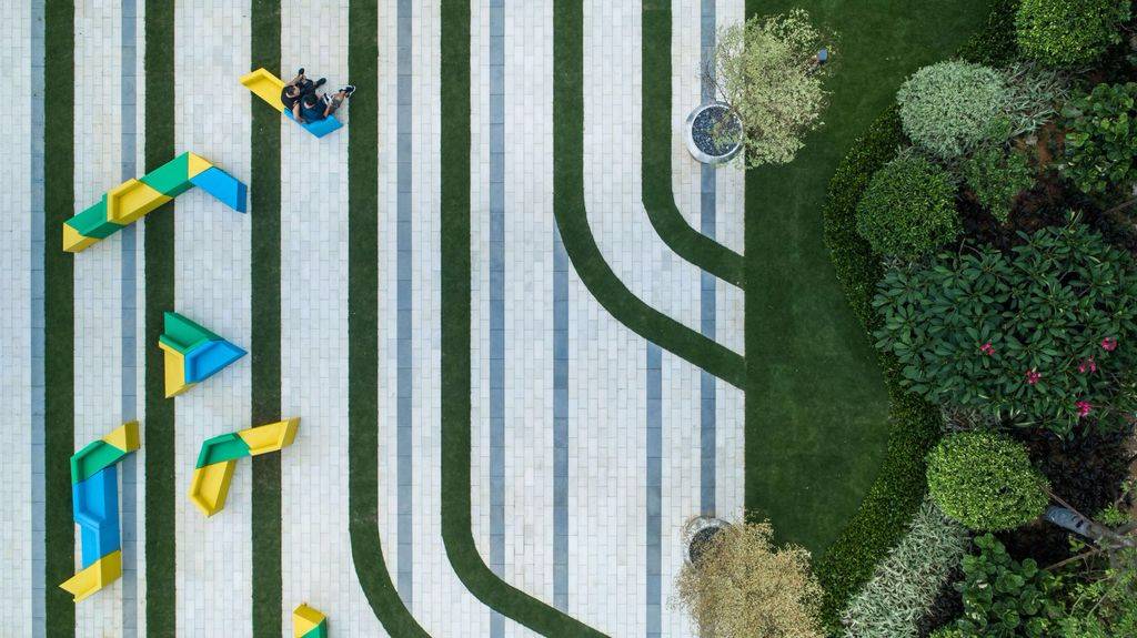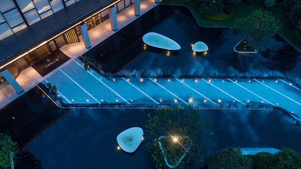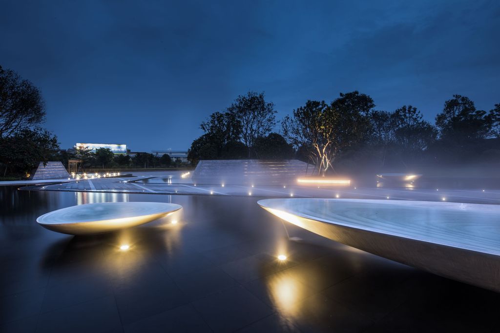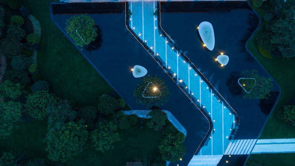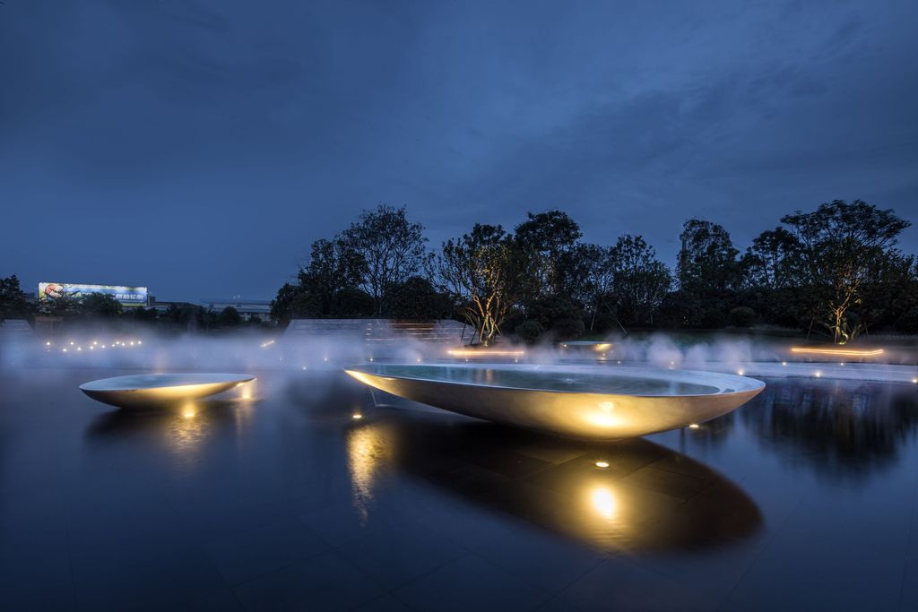 “魚兒”躍出水面,小巧的涌泉,點綴其中,當夜幕降臨,宛如墜入銀河的繁星點點,讓人們從喧鬧的都市生活中抽離,回歸到生活的本質。