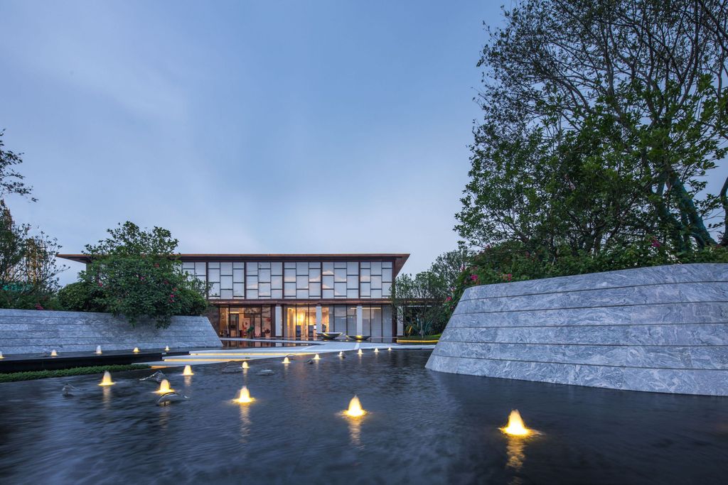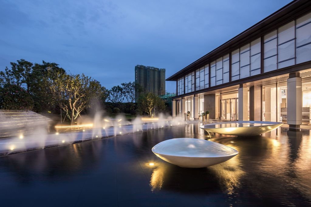 拾階而上,入口疊水和大面積的鏡面水景,潺潺的流水聲沿著主入口兩側跌水景池緩緩而下,給人愉悅、歡快的聽覺盛宴。開闊的鏡面映襯著精致、典雅的營銷中心建筑及主題性雕塑,仿佛置身于靜謐的湖泊之中。