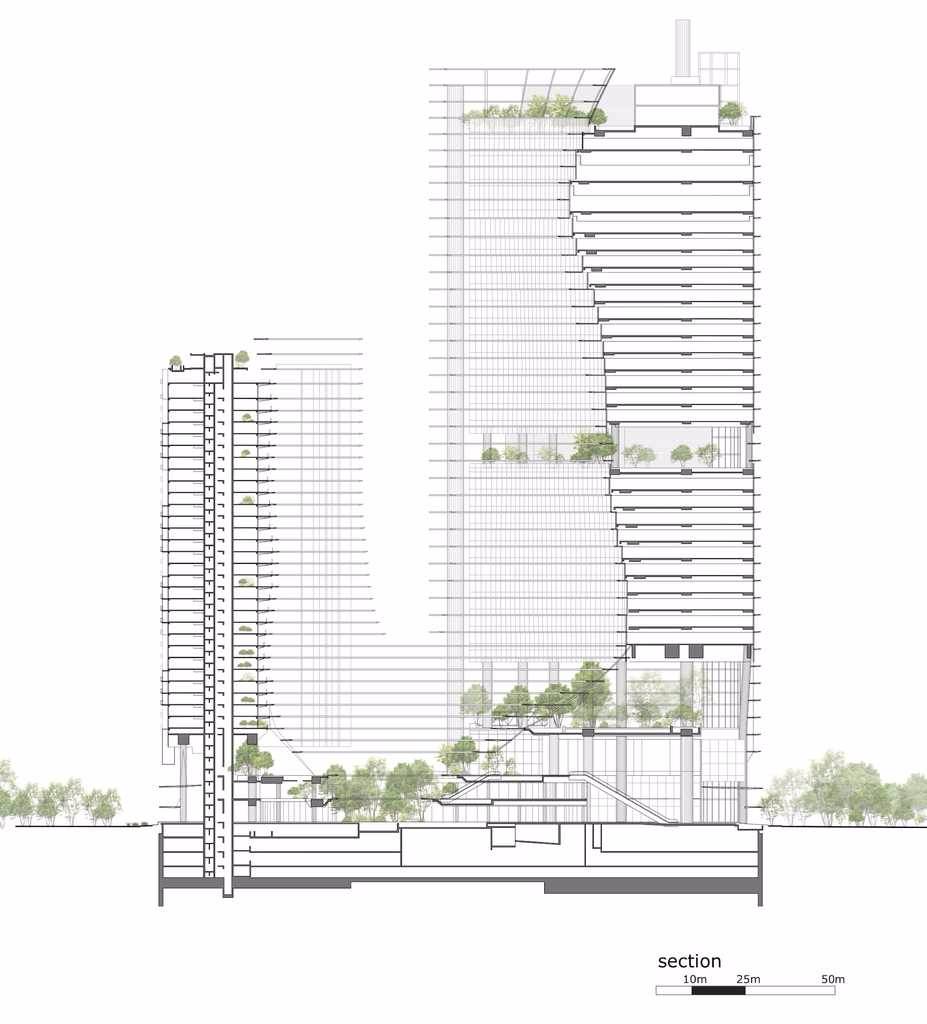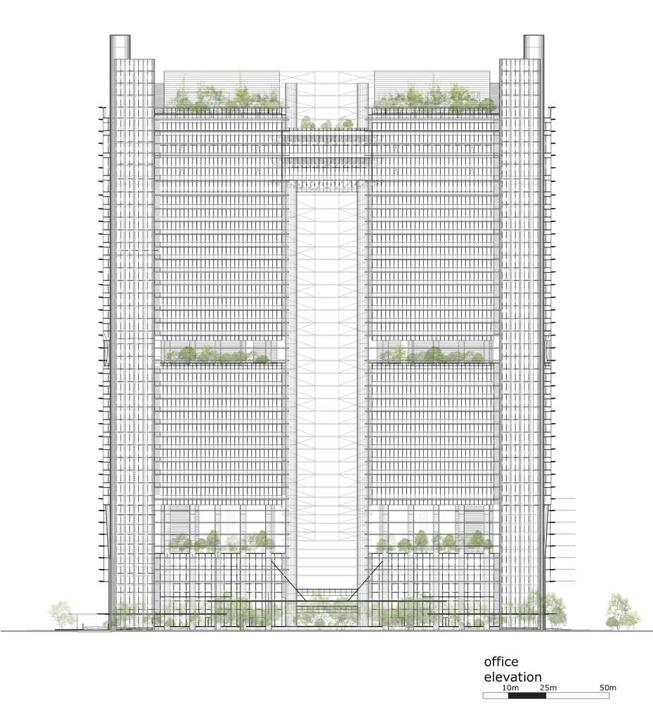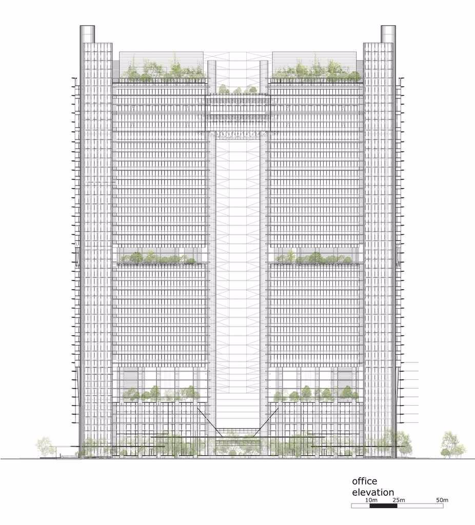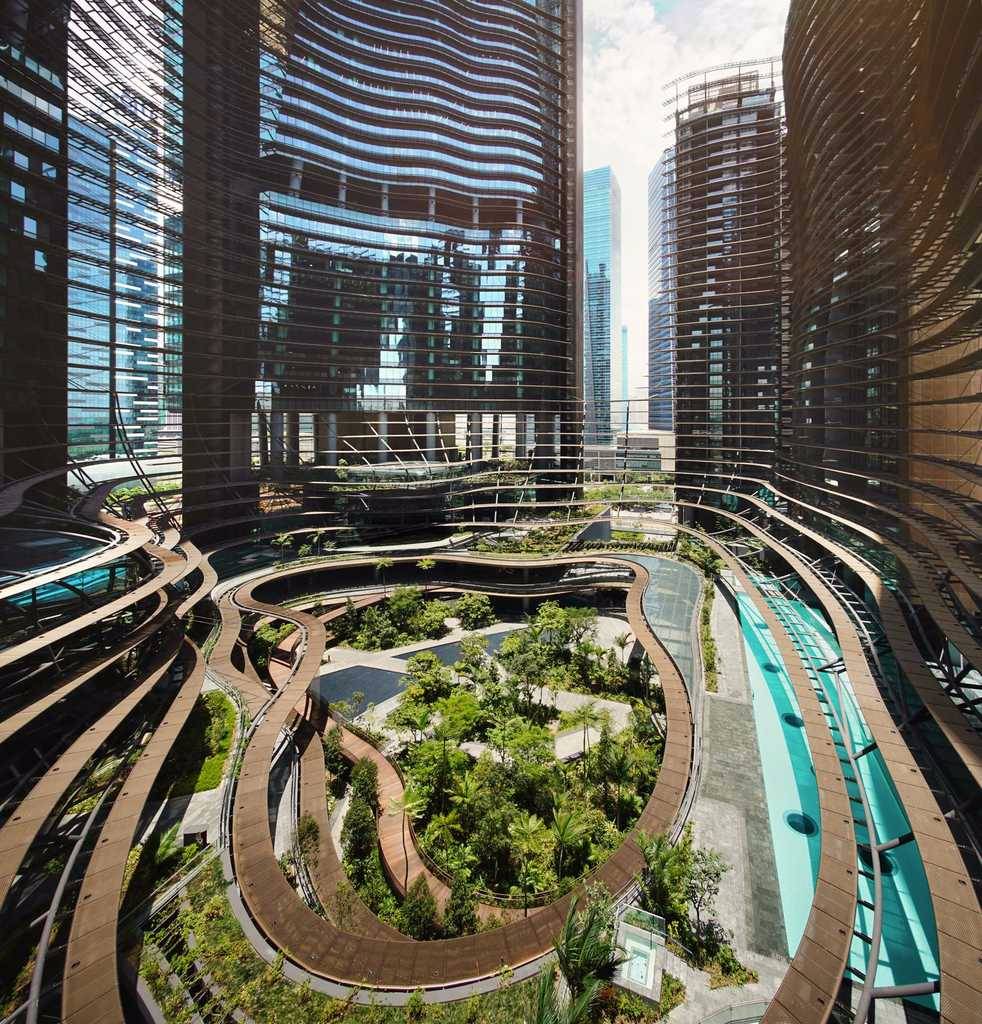 這個(gè)高密度建筑綜合體的綜合用途超過(guò)40萬(wàn)平方米,它由四個(gè)高層建筑組成,定義了綠色心臟——一個(gè)延伸到幾層樓的公共空間。這個(gè)立體的綠洲反映了熱帶植物的多樣性。