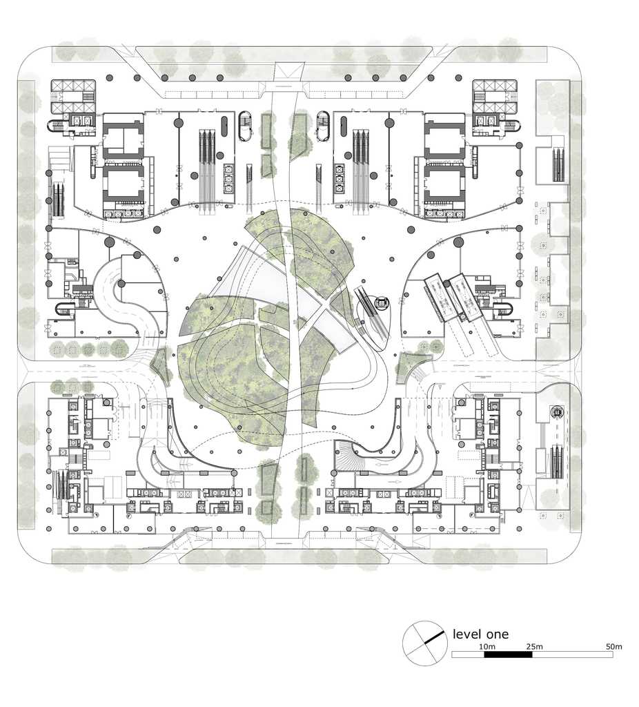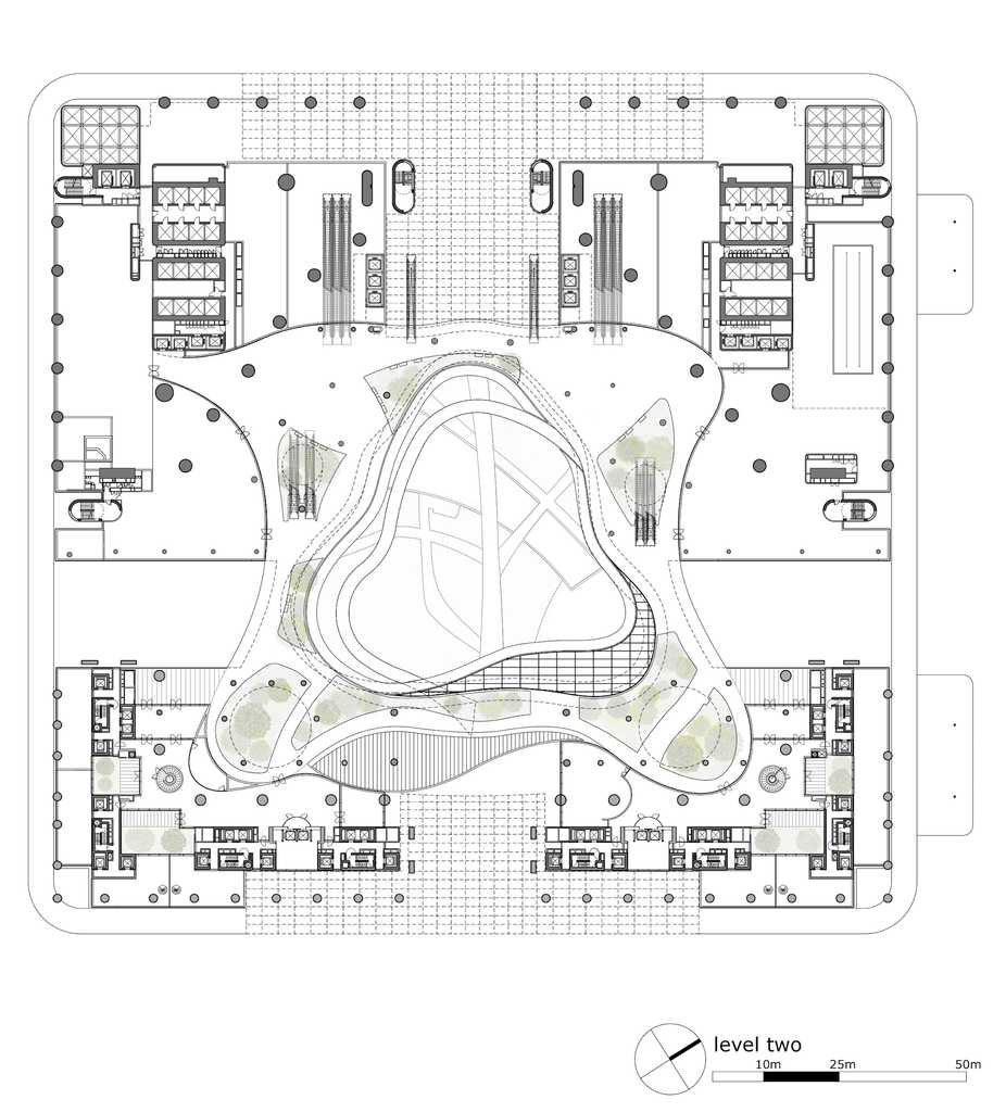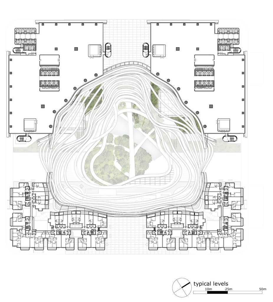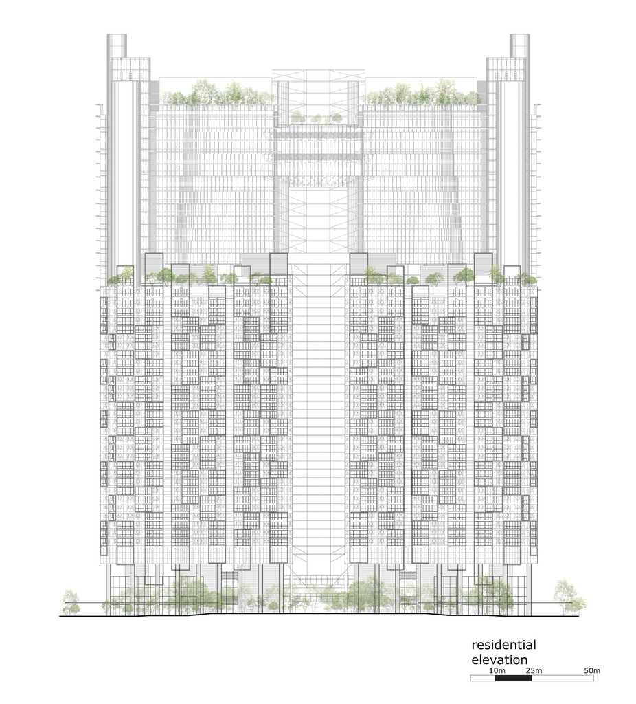 這個(gè)高密度建筑綜合體的綜合用途超過(guò)40萬(wàn)平方米,它由四個(gè)高層建筑組成,定義了綠色心臟——一個(gè)延伸到幾層樓的公共空間。這個(gè)立體的綠洲反映了熱帶植物的多樣性。