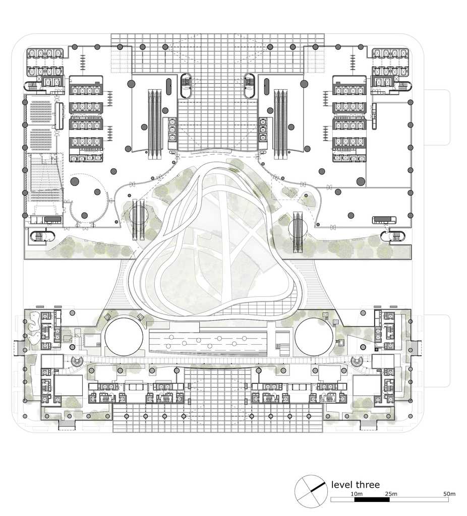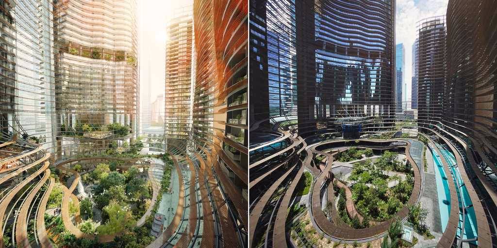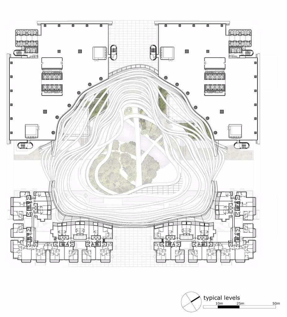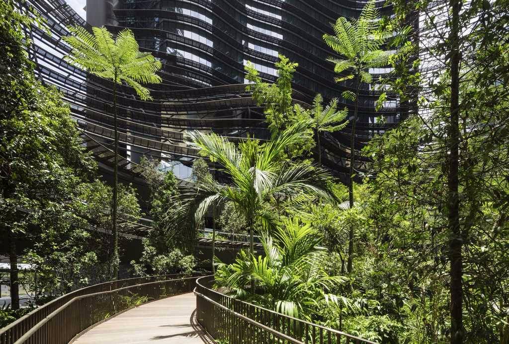 建筑綜合體的有機(jī)形狀及其標(biāo)志性的百葉窗和密集的種植,有助于改善小氣候和增加生物多樣性。受亞洲水田梯田的啟發(fā),由四個(gè)塔樓組成的綠色中心——帶有多層立體花園——反映了熱帶植物的多樣性,并創(chuàng)造了一個(gè)新的棲息地。這顆綠色的心臟由350多種不同種類的樹(shù)木和植物組成,其中包括700棵樹(shù),占地37000平方米。各種各樣的動(dòng)物成為這種生物多樣性的一部分。受雨林不同垂直水平上的自然氣候變化的啟發(fā),景觀建筑模仿了一個(gè)綠色山谷,其氣候隨層次變化。餐廳和咖啡館,零售區(qū)域,健身俱樂(lè)部,游泳池,超市,美食廣場(chǎng),以及不同露天平臺(tái)上的活動(dòng)區(qū)域,不僅為居民,辦公室工作人員和游客提供產(chǎn)品和服務(wù),還為社交活動(dòng)創(chuàng)造了場(chǎng)所。