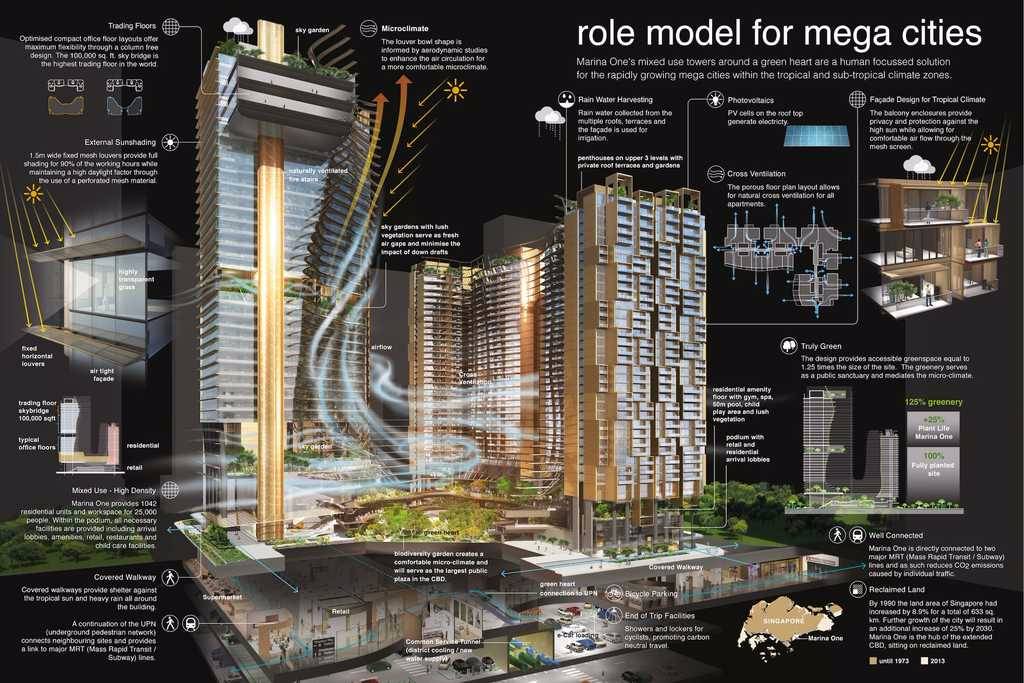 新加坡的Marina One是ingenhoven建筑事務(wù)所迄今為止最大的項(xiàng)目。該項(xiàng)目于2018年1月15日正式開(kāi)放。作為生活和工作的國(guó)際榜樣,Marina One在關(guān)于特大城市的討論中作出了創(chuàng)新性的貢獻(xiàn),特別是在熱帶地區(qū),在人口增加和氣候變化的背景下,這些地區(qū)面臨著巨大的挑戰(zhàn)。
