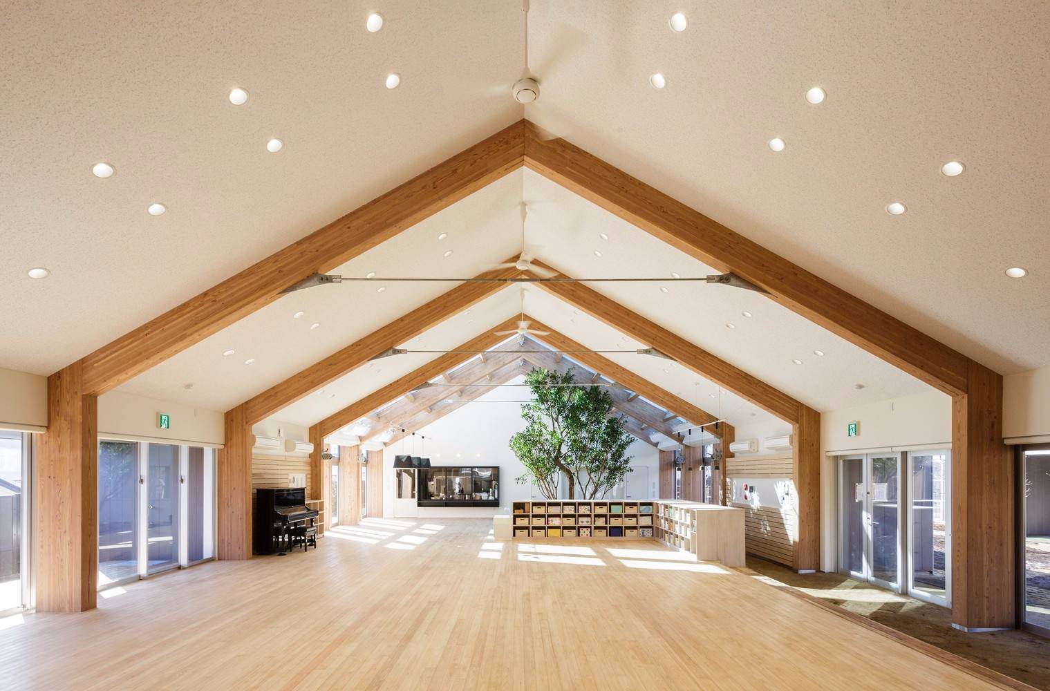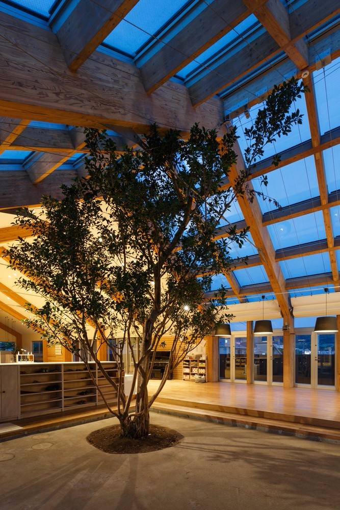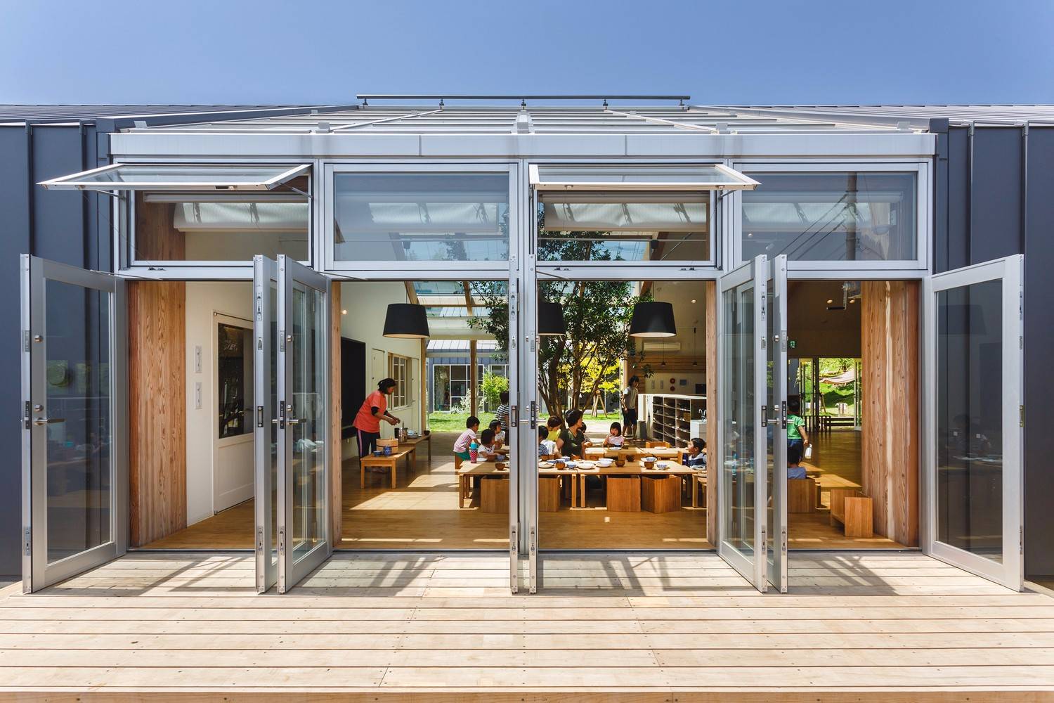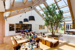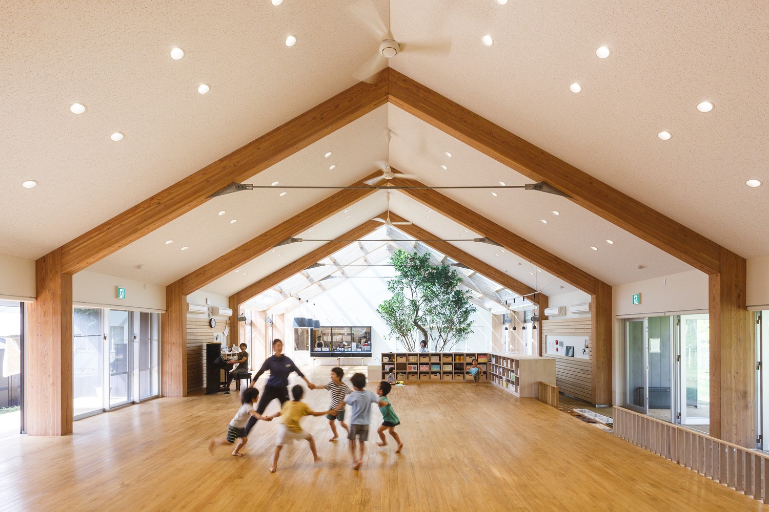 在育兒室中,有一棵巨大的榕樹(shù)(banyan tree)種在地面上,孩子們可以盡情地爬樹(shù)。陽(yáng)光可以透過(guò)玻璃制成的屋頂照射進(jìn)屋內(nèi),孩子們也可以在室內(nèi)看到天空中漂浮的云彩。在操場(chǎng)則有著一個(gè)具有5米高差的大山坡,孩子們從還在爬行的嬰兒時(shí)期便可以在這里觸碰到大地,并且還可以進(jìn)行許多活動(dòng)比如在坡上翻滾、滑行以及挖土等等。通過(guò)這些方式幼兒園可以為孩子們提供親近自然的日常,以及多樣的玩樂(lè)方式。
