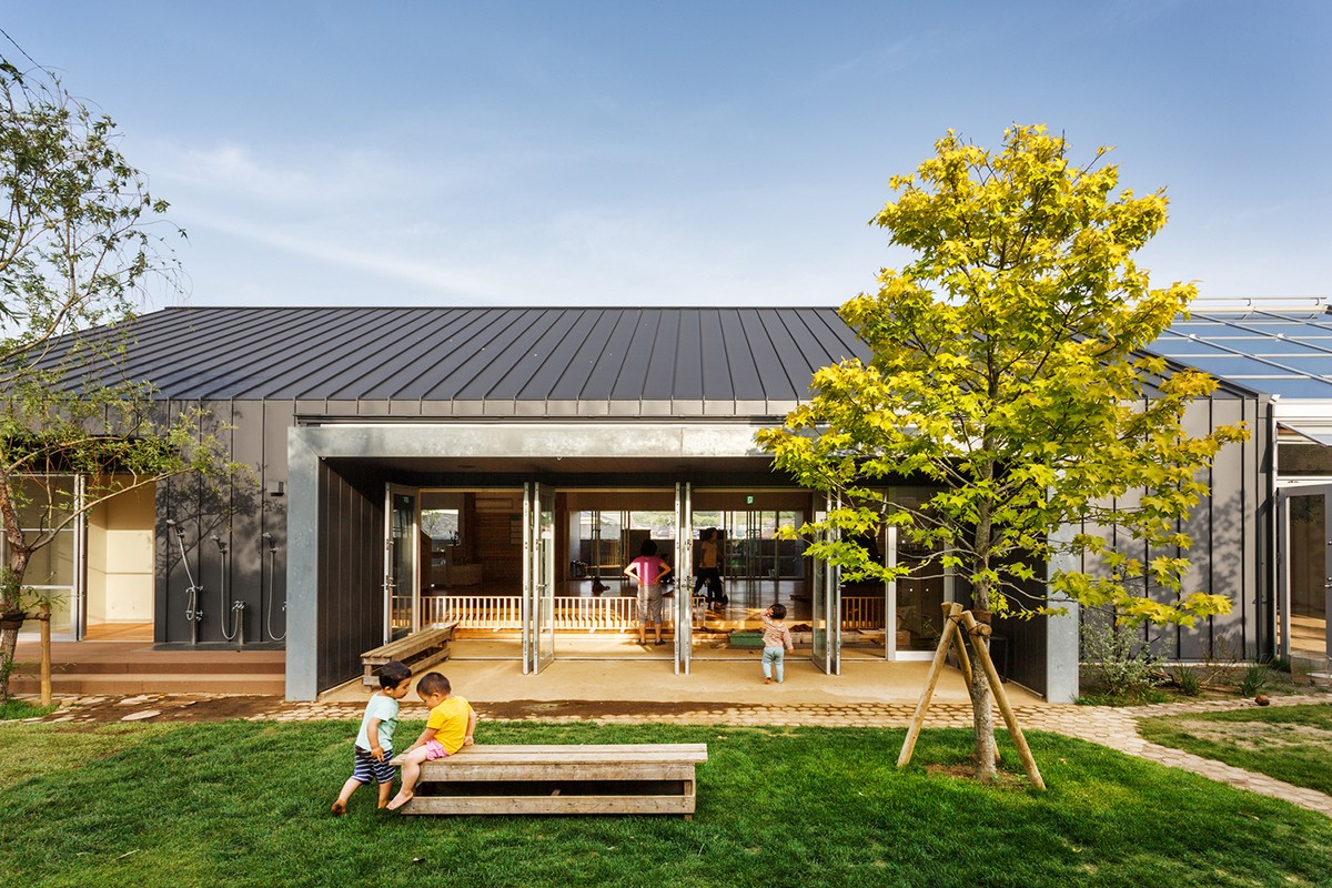 這是一個(gè)由家長(zhǎng)們組織建設(shè)的幼兒園,他們希望孩子可以在一個(gè)充滿自然元素的環(huán)境中長(zhǎng)大。為了達(dá)到他們的期許,設(shè)計(jì)師將周圍大面積的自然環(huán)境充分利用,讓孩子們一天內(nèi)無(wú)時(shí)無(wú)刻都可以感受到自然,并且可以在其中盡興玩耍和接受來(lái)自自然的感官刺激,以此進(jìn)一步發(fā)展孩子們的感知能力和創(chuàng)造力。