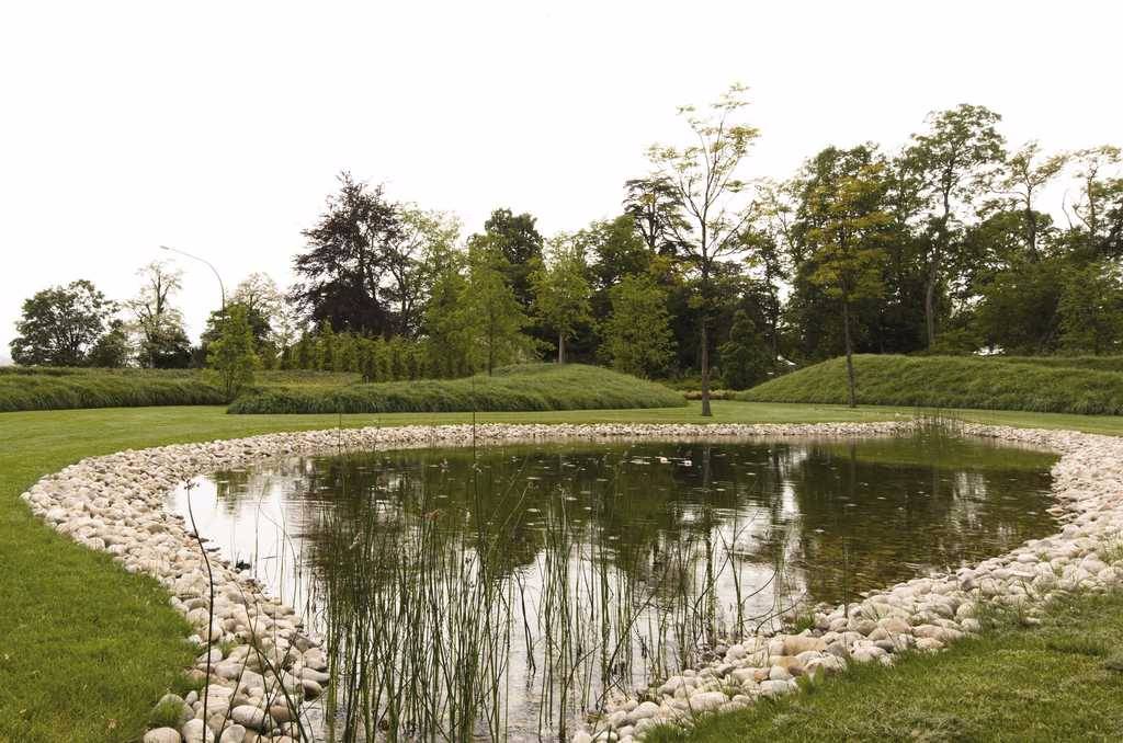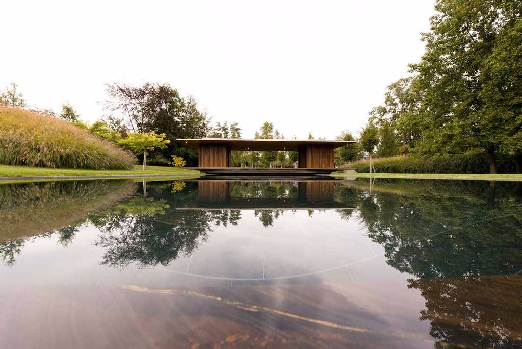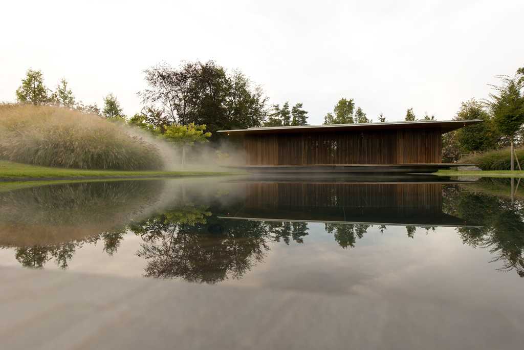 亭子和水池周圍的禾本科植物堆形成了一條流動的植物帶,隨著季節(jié)的變化,顏色也發(fā)生了變化,亭子被隱藏起來,只允許間接的感知。只有在深入土堆時,它才會被充分顯露出來。