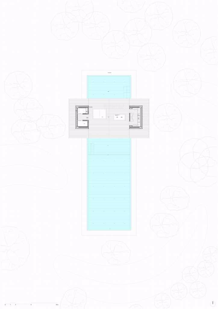 中央空隙包括在地板不對稱位置上的兩個輕微加強件,并且可以通過滑動元件從墻壁內(nèi)部封閉。每一個側(cè)面的體塊都包含不同的功能:西部的更衣室和浴室,東部的夏季廚房和儲藏室。為了營造亭子周圍的氛圍,屋檐上有一個集成的霧化系統(tǒng)。