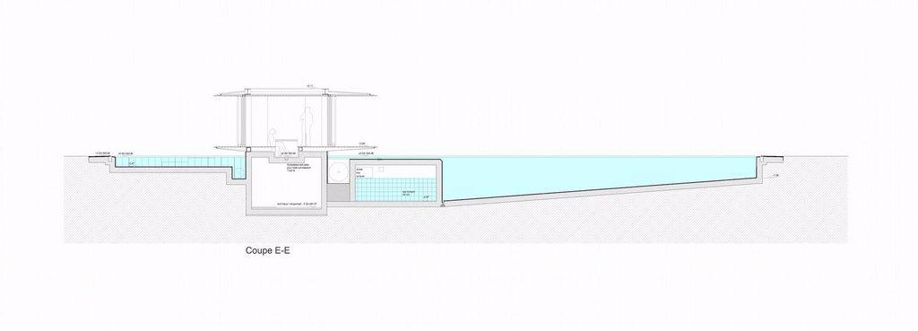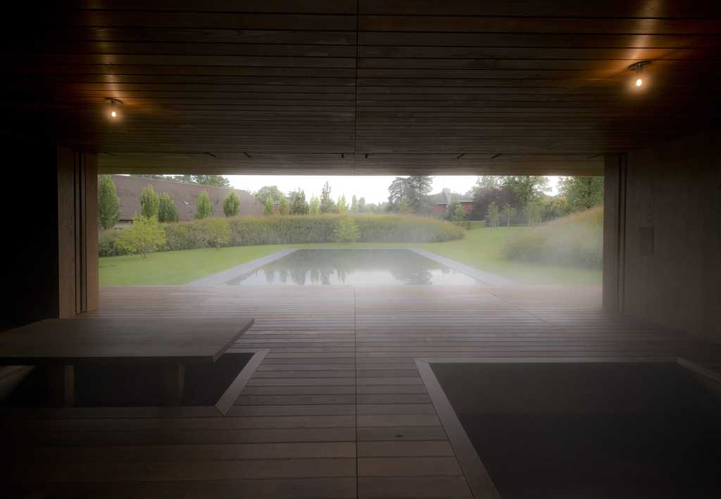 亭子本身由一個交叉的中央空隙組成,兩側(cè)有兩個橫向空間。它坐落在一個懸在草坪和游泳池上方的木制平臺上。該結(jié)構(gòu)由V4A不銹鋼制成,在墻壁、地板和天花板上覆蓋有熱涂層的固體灰木。