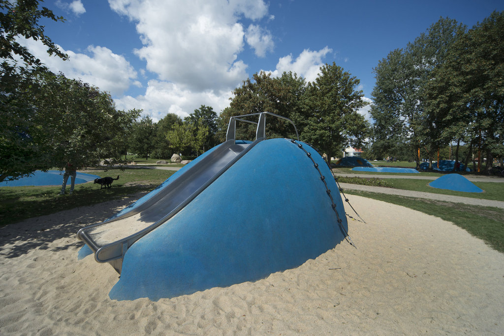 除了主題為“游戲軌道”的適合兒童年齡的設(shè)備和游樂場設(shè)計,游樂場還考慮到殘疾兒童及其同伴的需求。參考平行的“石頭痕跡”,該設(shè)計闡釋了對丘陵景觀意象,從而激發(fā)了游戲和運動的動力。除了易于玩耍的山丘,還有許多游戲元素,如鳥巢擺動、大滑梯、蹦床、沙灘游戲、爬山洞和攀爬。這些元素的設(shè)計故意選擇醒目的深藍(lán)色,因此可以清楚地看到場地上的游戲空間。