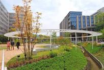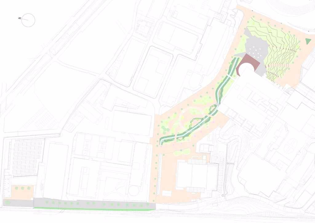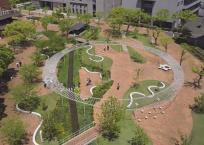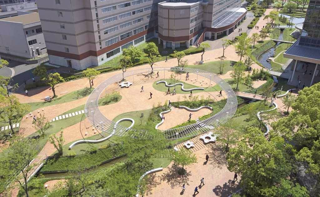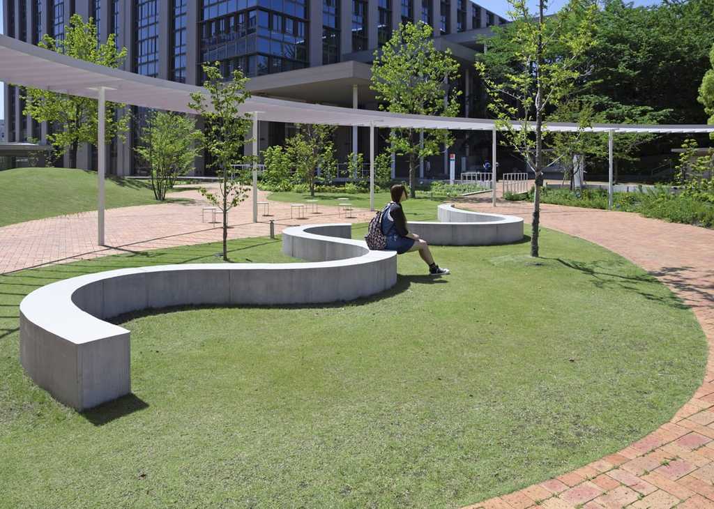 通過用與人行走的道路相應(yīng)的平緩曲線描繪鋪裝和草坪的邊界線,在確保動線功能的同時,提供了多種活動的場所。 以治水、排水為目的而利用的水路,作為綠色包圍的親水空間,成為校園的新魅力。 位于廣場中央的圓形藤架通過根據(jù)腳下的功能緩慢地改變寬度,柔軟地提示了校園的中心點。 以藤架為中心的中央廣場通過將動線空間和滯留空間一體化,成為各種活動混合的自然空間。