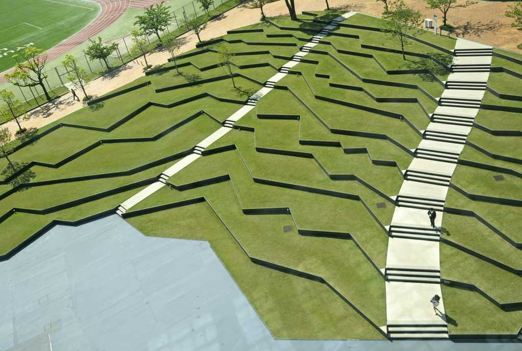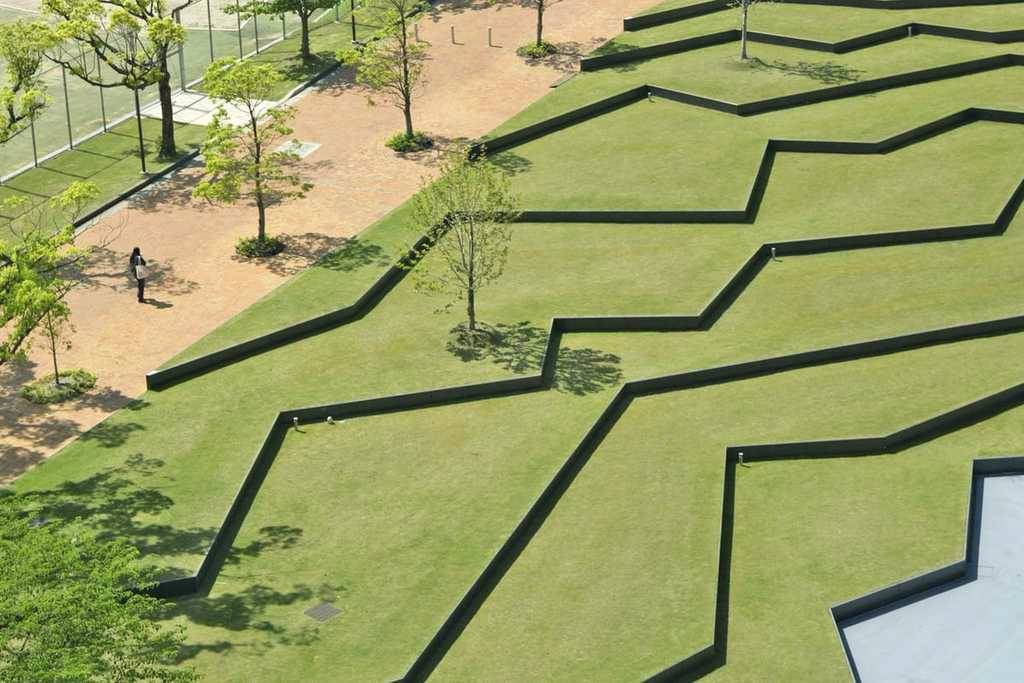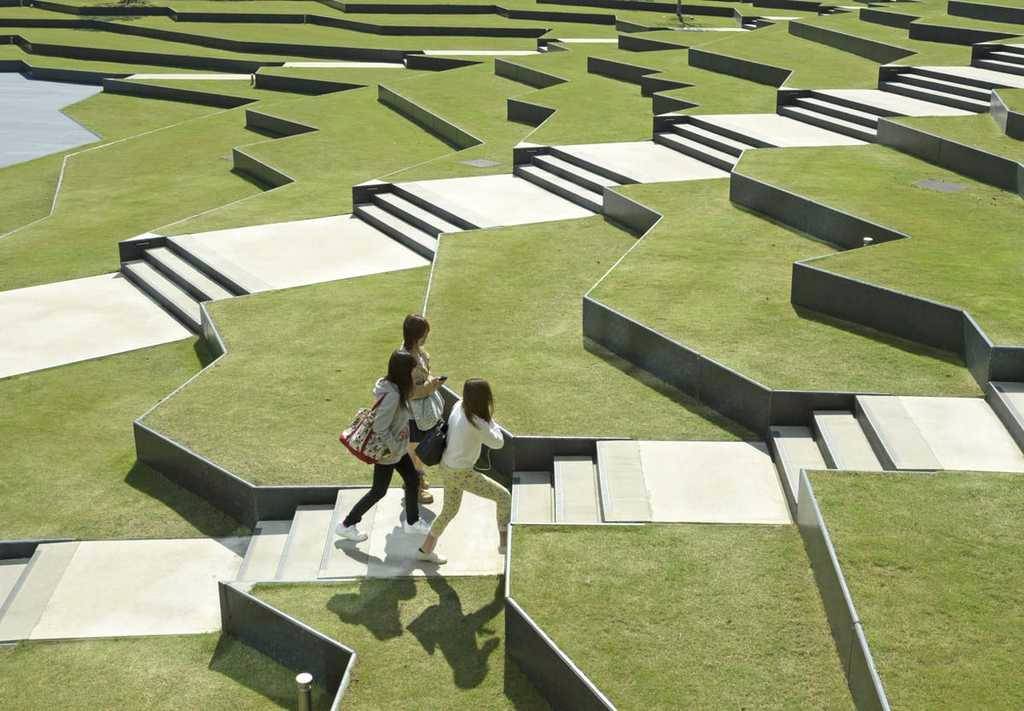 廣場利用現(xiàn)有的高差,形成了圖形化、令人印象深刻的梯田。 梯田是提供多種場所的滯留空間,作為動線功能的樓梯橫穿其中。 梯田和樓梯形成了一體的“地形”,其“地形”根據(jù)看到的角度呈現(xiàn)出各種各樣的風(fēng)景。 梯田廣場一邊充分利用當(dāng)初的地形,一邊向附加了新功能和魅力的空間再生。