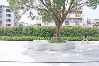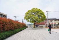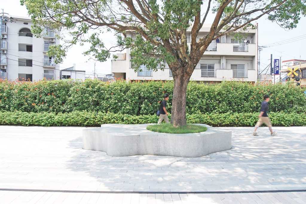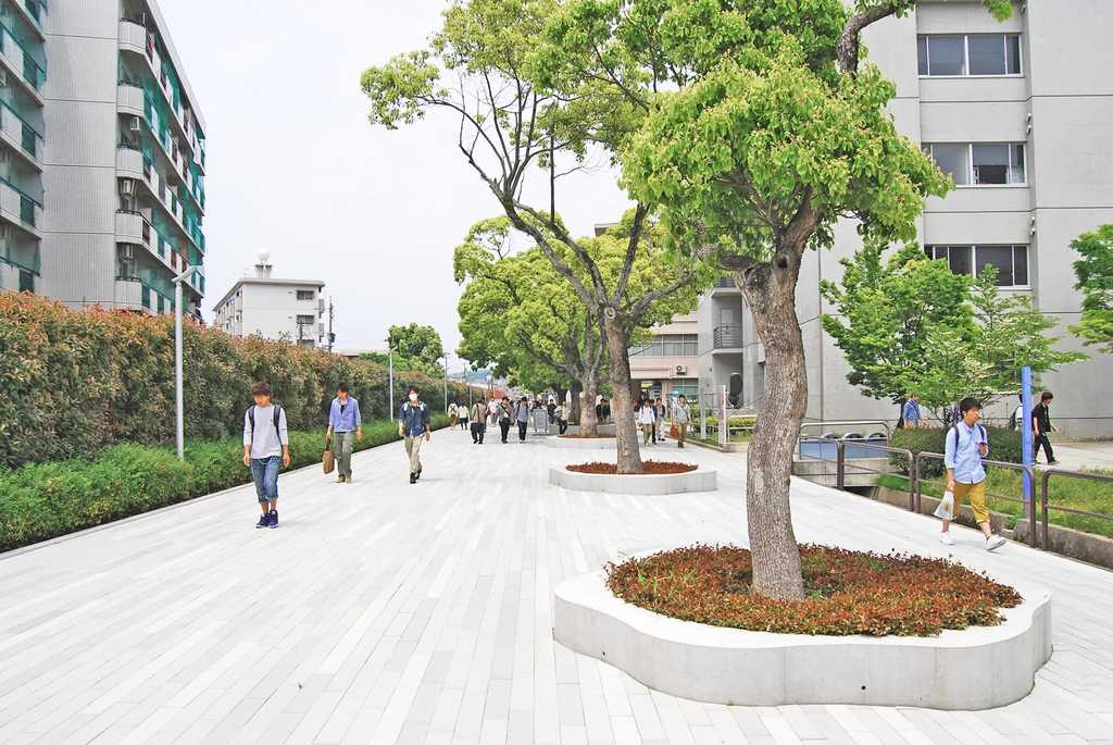 北門廣場主要是動線空間,計劃充分利用寬闊的街道,在學(xué)園節(jié)時也可以作為滯留空間使用。結(jié)合街道的直線設(shè)置,我們實施了纖細(xì)配色的鋪裝模式和現(xiàn)有樹周圍的花形坐凳等,使其成為具有親和力的舒適空間。