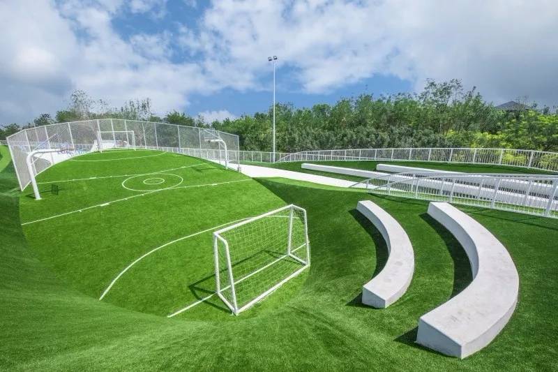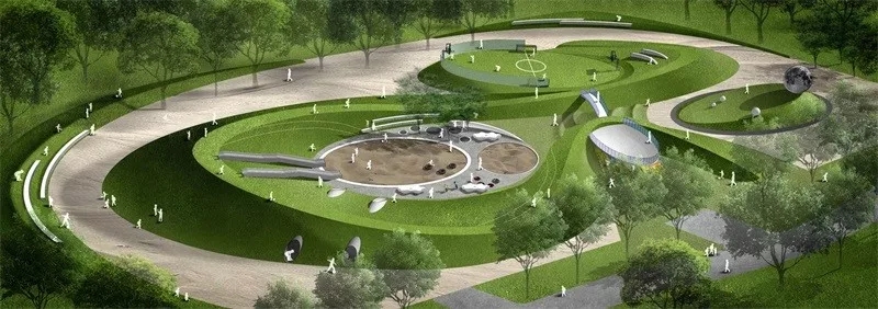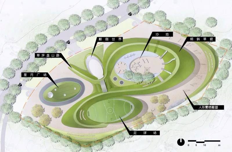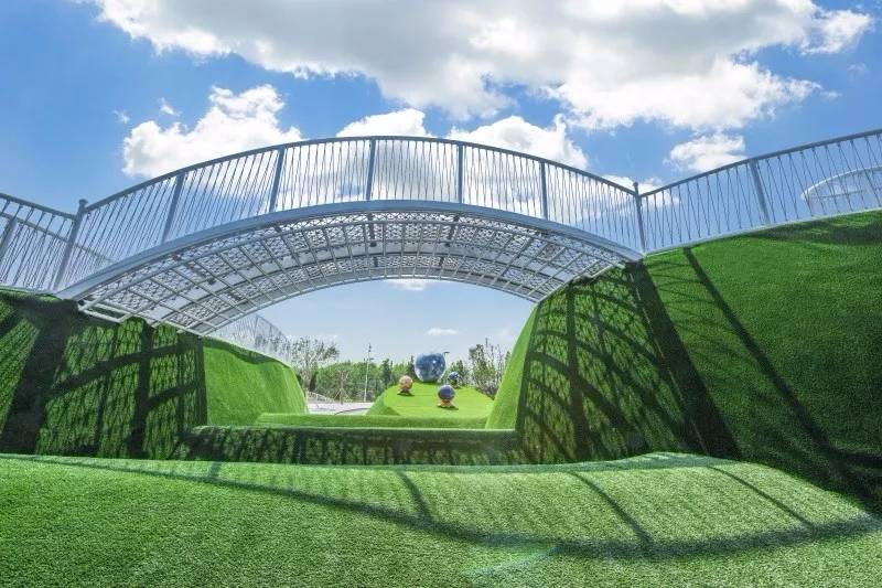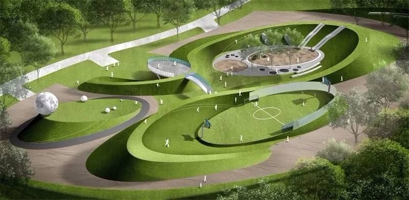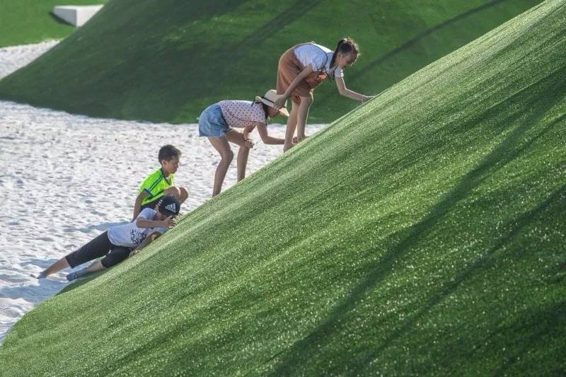 創(chuàng)意童趣展園顛覆了以往平地造園的方式,利用傾斜的場(chǎng)地創(chuàng)造空間,激發(fā)童趣。流線型的綠草坡圍合、界定了一系列開(kāi)放與閉合的空間。高低起伏的草坡,猶如從大地中生長(zhǎng)出來(lái)一樣,蘊(yùn)藏著自然的奧秘。創(chuàng)意童趣展園還打破了傳統(tǒng)的交通流線模式,通過(guò)開(kāi)放式的入口與自由的交通流線,讓孩子們自由地探索不同道路,學(xué)會(huì)獨(dú)自面對(duì)未知、完成挑戰(zhàn)。
