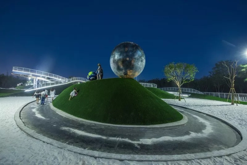 創(chuàng)意童趣展園位于園博園的西南側(cè),園區(qū)面積4200平米,相當(dāng)于一個(gè)足球場(chǎng)的大小。為適應(yīng)不同年齡段孩子的喜好、提供多種類型的游戲活動(dòng),創(chuàng)意童趣展園設(shè)置了印象引導(dǎo)區(qū)、兒童游戲區(qū)、兒童運(yùn)動(dòng)區(qū)、月亮裝置主題區(qū)四個(gè)功能區(qū)塊。孩子的成長(zhǎng)離不開(kāi)大人的陪伴,創(chuàng)意童趣展園還增設(shè)了大人看護(hù)區(qū)。
