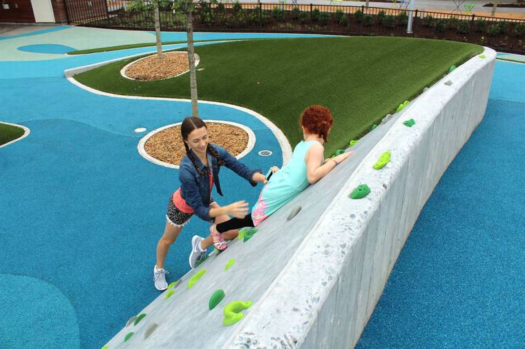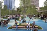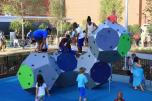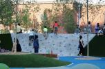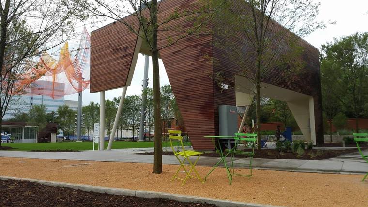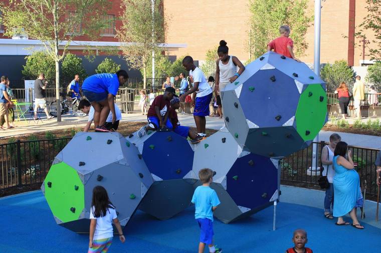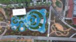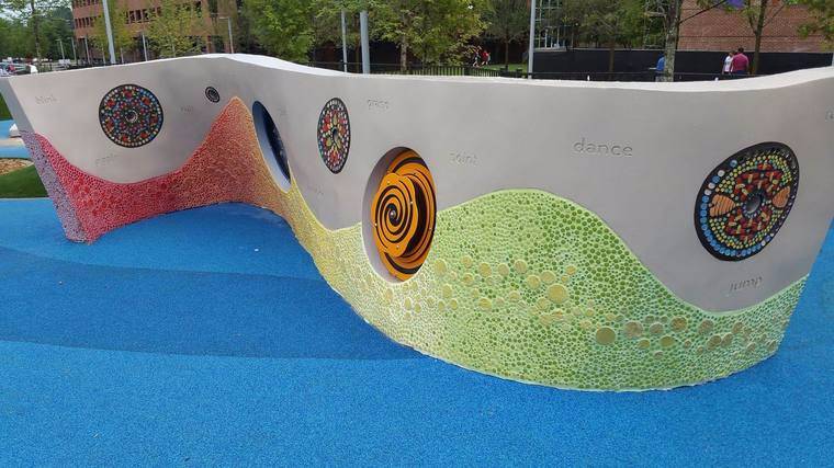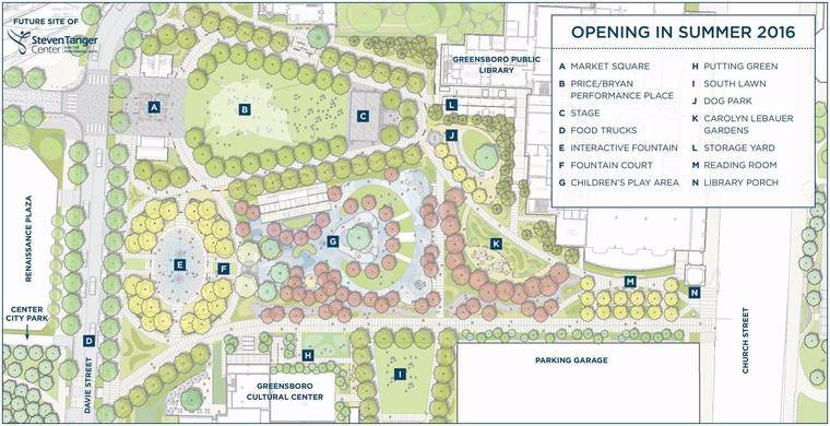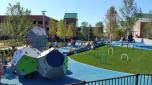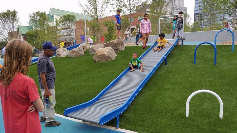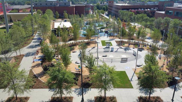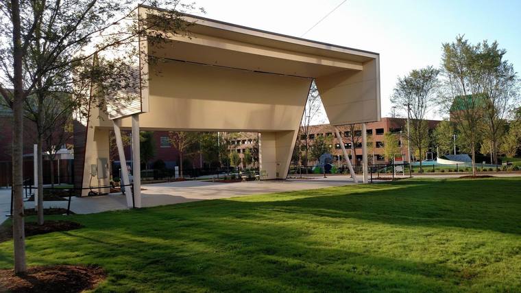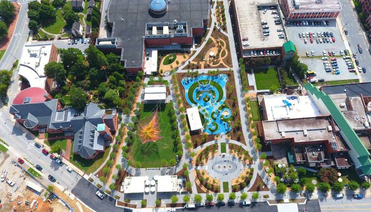 位于格林斯博羅市中心的4.5英畝土地上,該公園的最終實施將重新調(diào)整主要的街市街道,與周邊的藝術(shù)中心建立更強的關(guān)系,并將成為新的文化藝術(shù)區(qū)的核心。該公園圍繞一個音樂會草坪和表演亭組織,將由著名的波士頓藝術(shù)家珍妮特·埃切爾曼(Janet Echelman)安裝。積極規(guī)劃的公園還將包括一個重要的兒童花園和互動水景、狗公園、閱覽室、游戲區(qū)、槌球草坪。這個草坪可以容納聚集足夠的市民,草坪上空的絲帶燈格外的惹眼,特別是在燈光下的那幾根線條,讓柔軟的飄帶增加了硬朗的輪廓。整個兒童場地都是通過塑造了不一樣的高差關(guān)系讓空間更加有趣,同時仿真草坪的應(yīng)用不僅僅耐久同時更加安全親人。其實OJB這兩個項目都用了橢圓形元素,他們在其他項目中也有體現(xiàn),其中有一個就是“美國達拉斯新月形酒店庭院”。