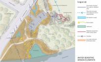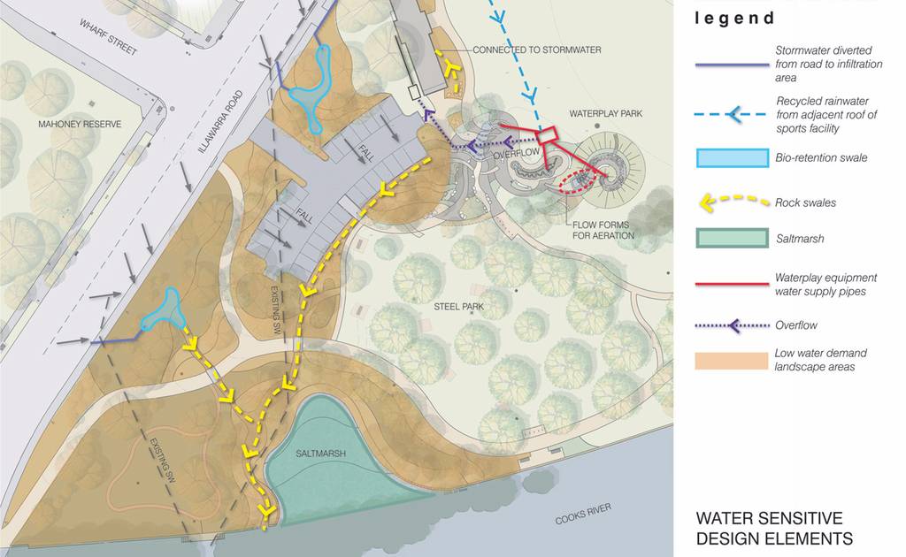 場地規(guī)劃和合同設計及文件包括了新的水上樂園、鹽沼、區(qū)域自行車道、布什塔克花園和停車場。設計協調了現有停車場、生物過濾區(qū)、洼地和低用水量種植區(qū)的鹽沼在內的水敏設計元素。