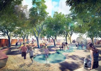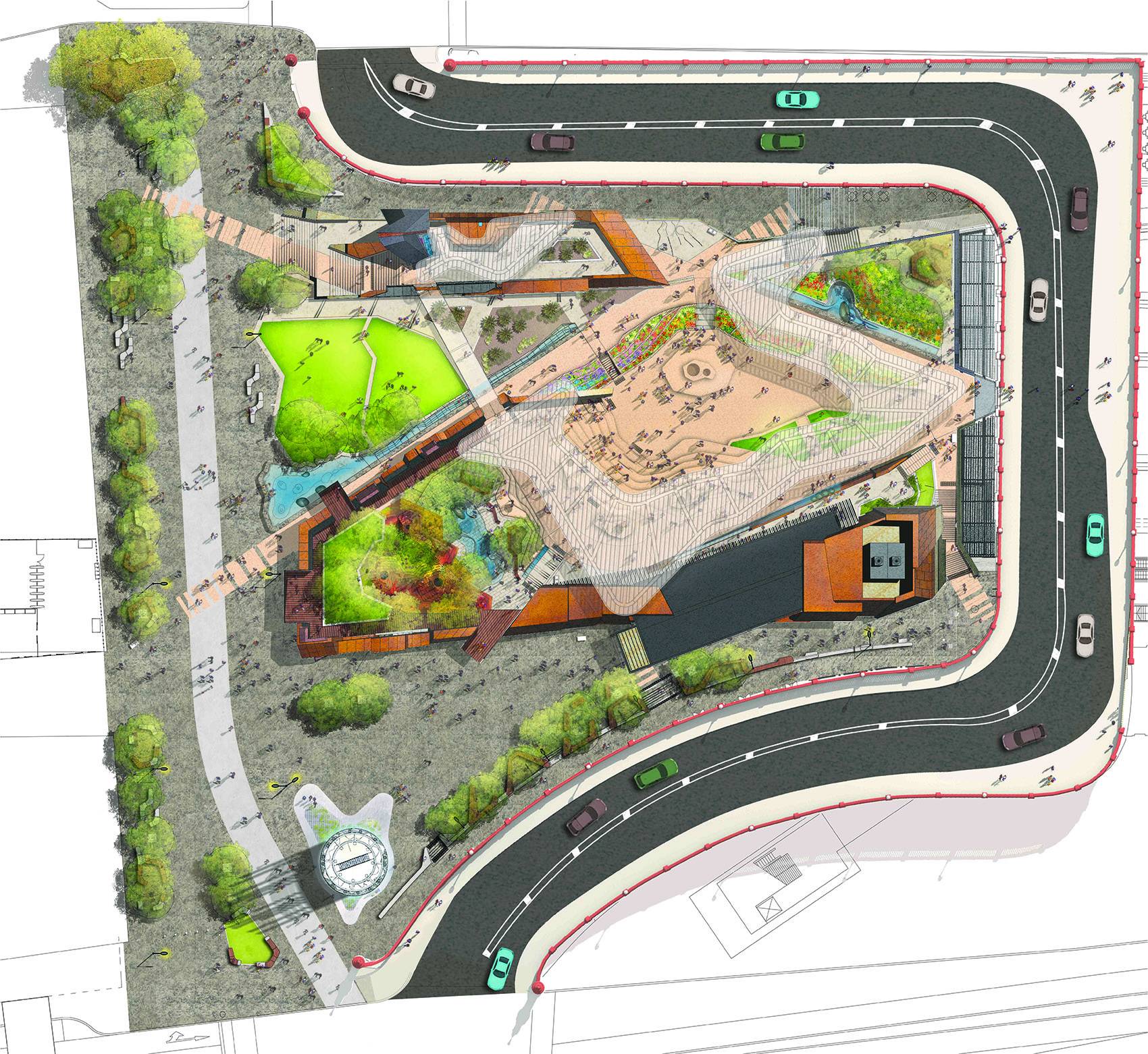 整個(gè)項(xiàng)目團(tuán)隊(duì)面臨的一個(gè)重大挑戰(zhàn)是在兩條地下鐵路線上,建造一個(gè)全新的公共空間和建筑。其中一條鐵路線的開端在隧道里,而主要的中心景觀則直接坐落在這個(gè)陡峭傾斜的隧道之上,確保了這些地區(qū)的小范圍覆土深度和樹木種植。大部分的景觀設(shè)計(jì)區(qū)域坐落在基礎(chǔ)設(shè)施或是現(xiàn)有構(gòu)筑物的頂部,因而形成了一個(gè)復(fù)雜的隆起景觀形式,需要大量依靠與工程師和建筑師的合作協(xié)調(diào)來確保最終的設(shè)計(jì)成果,如多項(xiàng)綠色基礎(chǔ)設(shè)施技術(shù):輕質(zhì)土壤、空隙形成劑、鋪裝礫石系統(tǒng)和用于樹木的地層拱頂系統(tǒng)。來自各領(lǐng)域頂尖的設(shè)計(jì)師組成的團(tuán)隊(duì),傾力打造激動(dòng)人心的公共廣場,除了為人們的生活帶來更多美好,同時(shí)帶動(dòng)了整個(gè)城市的發(fā)展與成長。