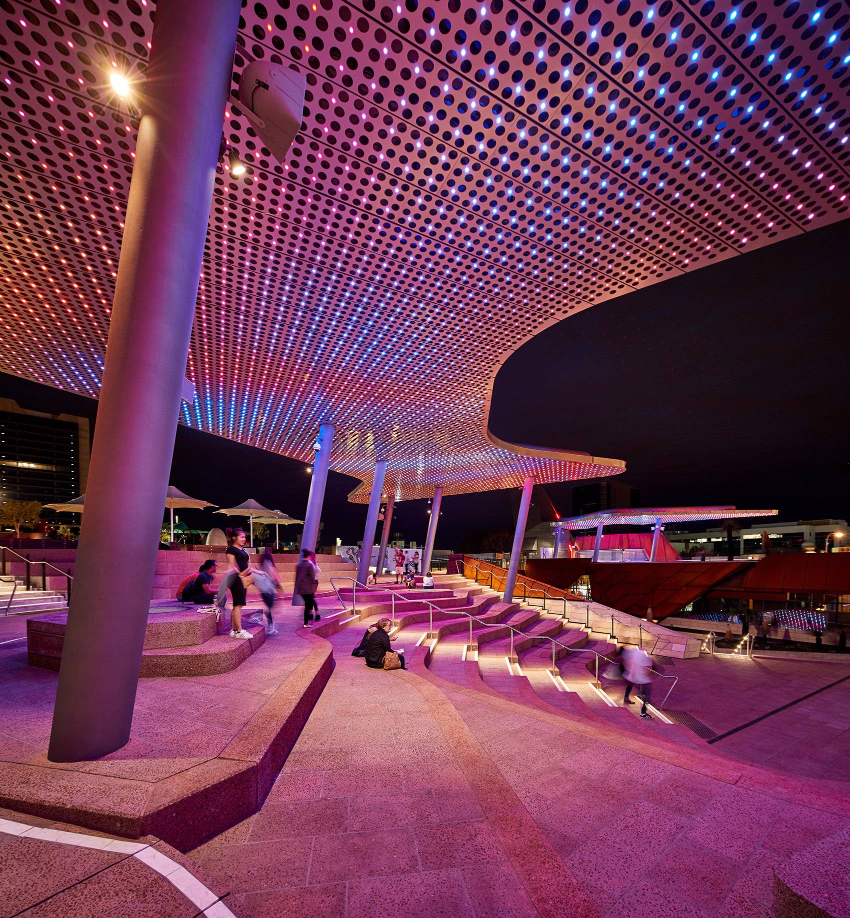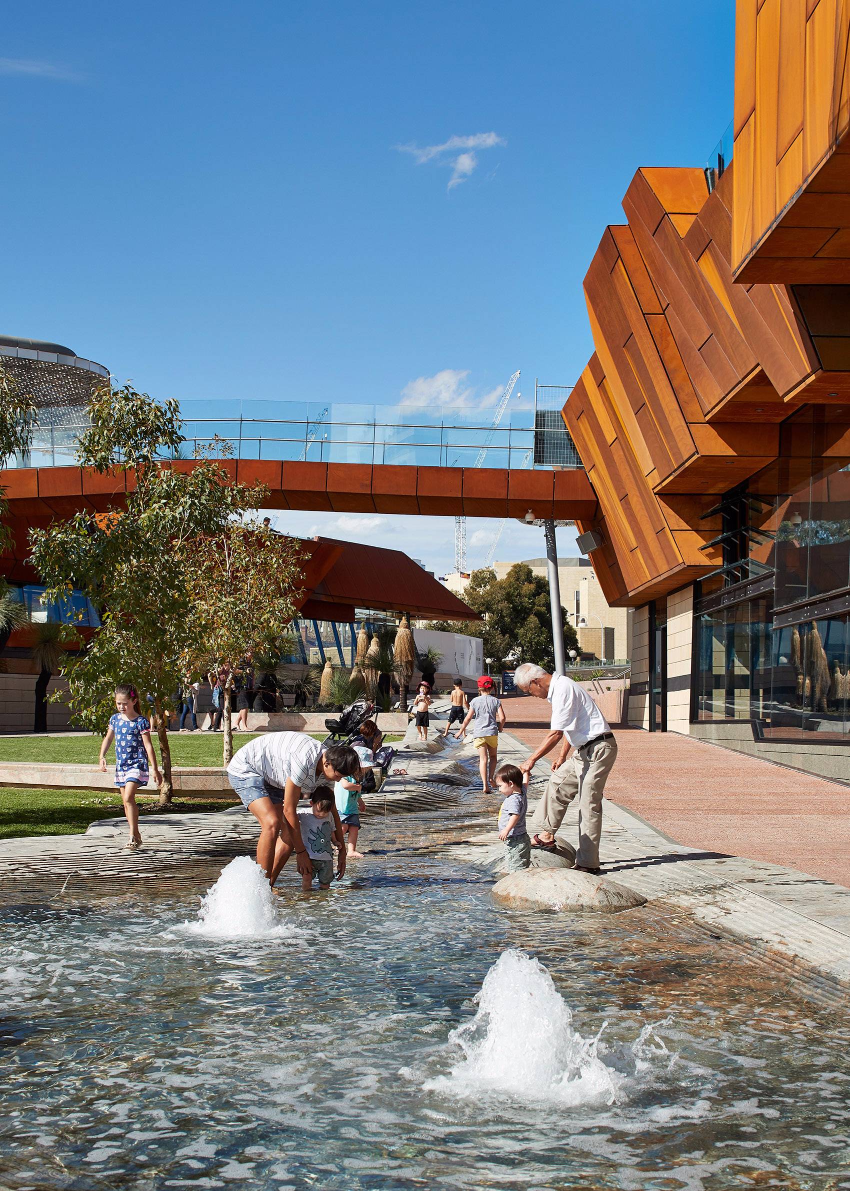 西澳大利亞首府珀斯Perth有了一個(gè)嶄新的公共活動(dòng)空間目的地 – 雅干廣場(Yagan Square),是當(dāng)前珀斯最令人興奮的重新開發(fā)的設(shè)計(jì)項(xiàng)目,讓人們可以來到這里聚會(huì)購物,舉辦各式會(huì)議和慶典活動(dòng)等。這項(xiàng)目是由首席建築師Lyons里昂和iredale pedersen hook建筑團(tuán)隊(duì)與澳派景觀設(shè)計(jì)工作室ASPECT Studios所共同合作完成的項(xiàng)目。 一支由首席建筑師,景觀建筑師,藝術(shù)家和專業(yè)設(shè)計(jì)師組成的團(tuán)隊(duì),傾力呈現(xiàn)Whadjuk的民族故事,解決各種工程技術(shù)挑戰(zhàn),保證環(huán)境可持續(xù)發(fā)展的同時(shí),竭力呈現(xiàn)當(dāng)?shù)氐奶厣匦魏酮?dú)特景觀。