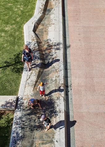 雅干廣場是為了紀(jì)念著名的當(dāng)?shù)赜率縔agan于2014年5月命名的,該區(qū)是西澳大利亞市中心的一個(gè)文化展示區(qū),用于展現(xiàn)當(dāng)?shù)睾蚖hadjuk的遺產(chǎn)、生產(chǎn)、環(huán)境和文化的地方。為了創(chuàng)造最真實(shí)的文化體驗(yàn),與Whadjuk社區(qū)廣泛接觸,以Whadjuk人分享的文化為起源,將靈感注入到場地、人、生物和景觀創(chuàng)作主題中,讓這些主題和故事影響了雅干廣場內(nèi)的諸多設(shè)計(jì)元素。設(shè)計(jì)理念完美詮釋了雅干廣場的愿景—旨在融合當(dāng)?shù)?、珀斯以及西澳大利亞的特色,建立一個(gè)包容、開放、充滿活力的公眾聚集地。將地理、軌跡、敘述、原住民和非原住民以及雅干廣場本身的文化連接在一起。當(dāng)?shù)靥厣▓@更展現(xiàn)了的西澳大利亞獨(dú)特和多樣化的園林植物景觀。不僅讓游客看到珀斯當(dāng)?shù)睾推渌莸挠燃牙麡浞N,也豐富了西澳大利亞的季節(jié)特色。與多學(xué)科藝術(shù)家Jon Tarry共同合作完成的大型水景雕塑是Yagan Square雅干廣場的一大亮點(diǎn)。這個(gè)藝術(shù)品一般的雕塑長約190米,由一系列相互連接的石頭組成,從上層廣場一直延伸到下層購物中心,流暢的設(shè)計(jì)元素提升了場地的體驗(yàn)感,游客可以隨意觀賞、觸摸、感受與享受。]