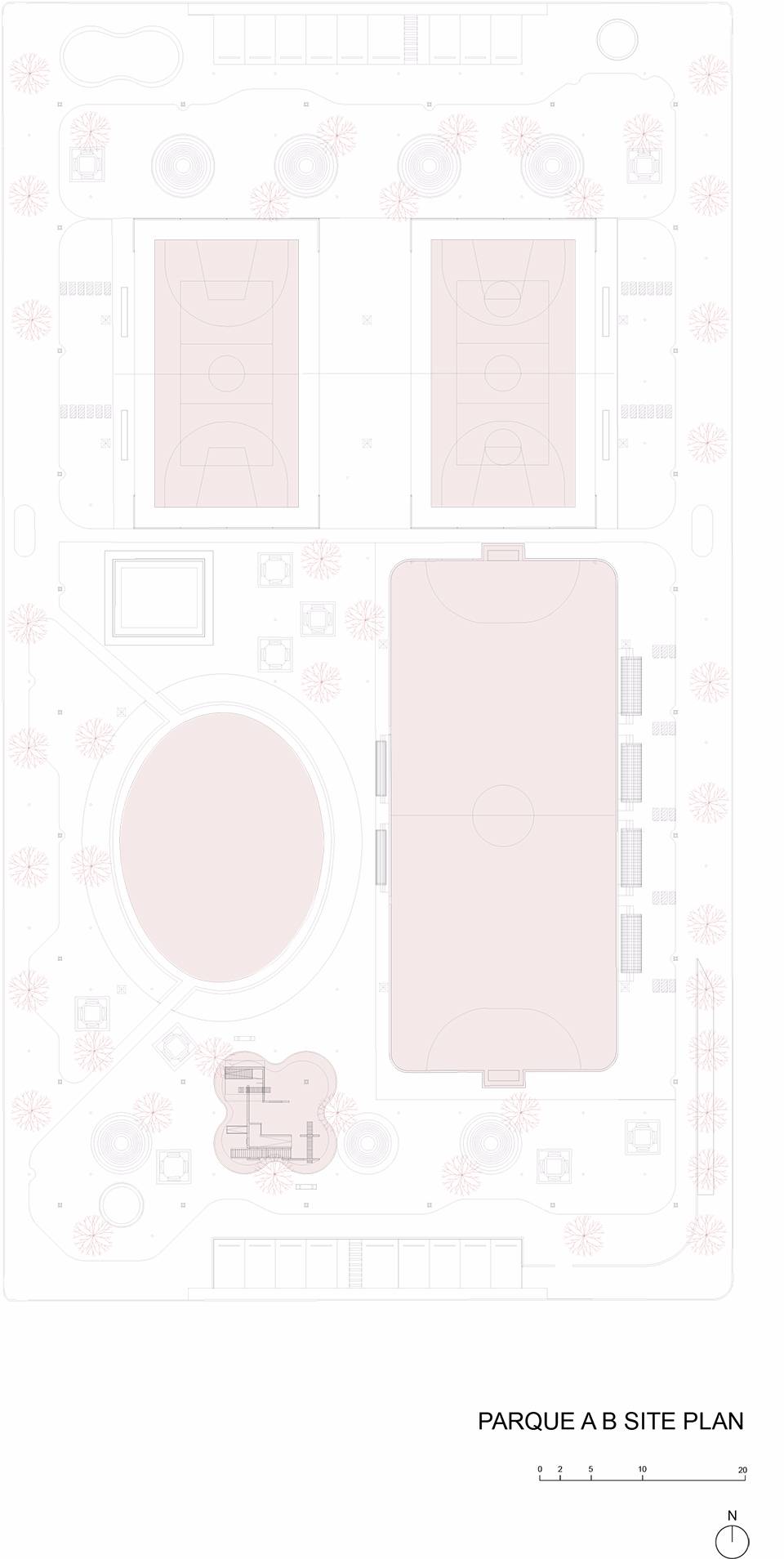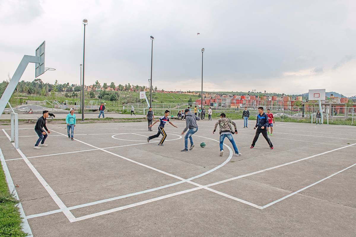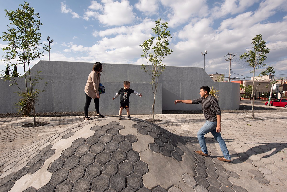 Los Héroes公園改造項目位于Toluca de Lerdo市的LosHéroesSecciónIII居住區(qū)內(nèi)。設(shè)計師采用單一模數(shù)鋪裝改造現(xiàn)有道路,以此來劃分不同的空間和限定新的活動。 這種模數(shù)鋪裝采用六邊形的鵝卵石,如同像素一樣,有利于與地形吻合并且布局靈活。同時,設(shè)計師將100棵樹木每隔3米進行布置,組成了樹形網(wǎng)格 。公園中還設(shè)置了兒童游樂場、足球場、籃球場和滑冰場,這些都旨在提高臨近居民和學(xué)生的生活質(zhì)量。