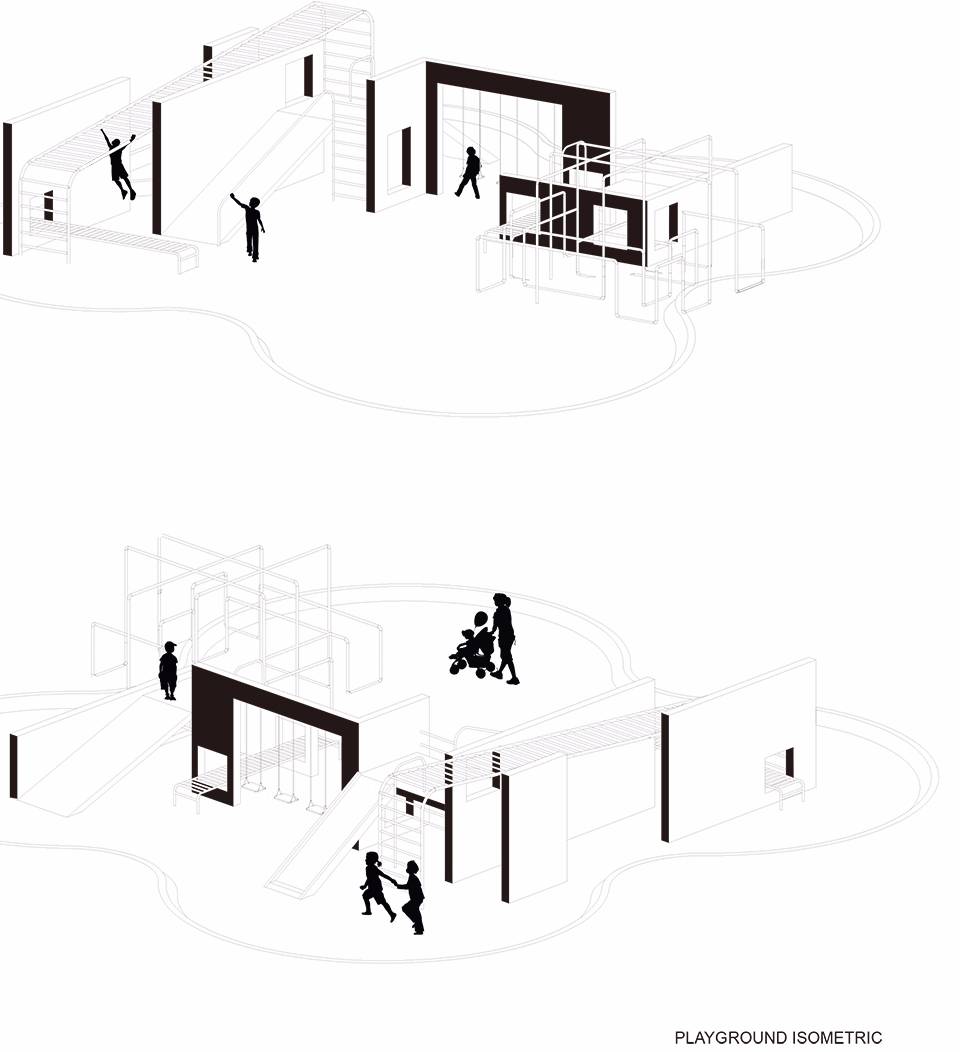 ▼兩個公園里的游樂場設(shè)施均采用混凝土墻和金屬條進行多種組合布置