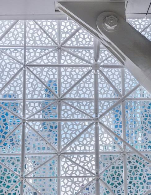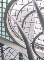 交通中心內(nèi)部空間開敞而明亮,高高在上而又結(jié)構(gòu)清晰的天窗——“光柱”天窗將陽光引入室內(nèi),營(yíng)造出活躍又溫馨的氣氛。最大的光柱形成了客運(yùn)中心主要公用空間——36米高“大廳”的中心景觀。從公園出發(fā),向下穿過公交車站和大廳,可一直通往火車站臺(tái)的地下兩層,這一構(gòu)思新穎的結(jié)構(gòu)為交通中心的周邊區(qū)域帶來了充足光照,并形成了優(yōu)雅深遠(yuǎn)的觀景區(qū)。
