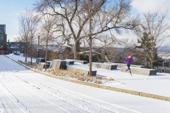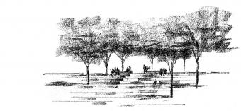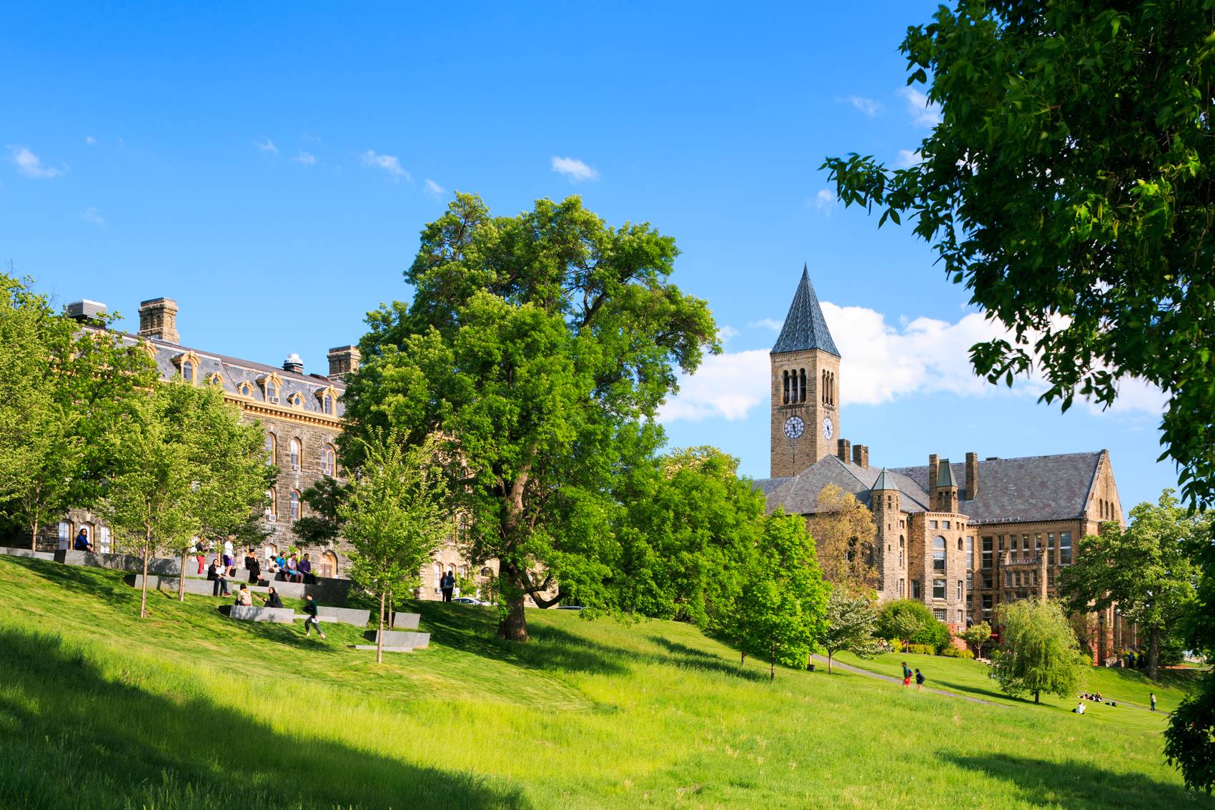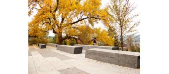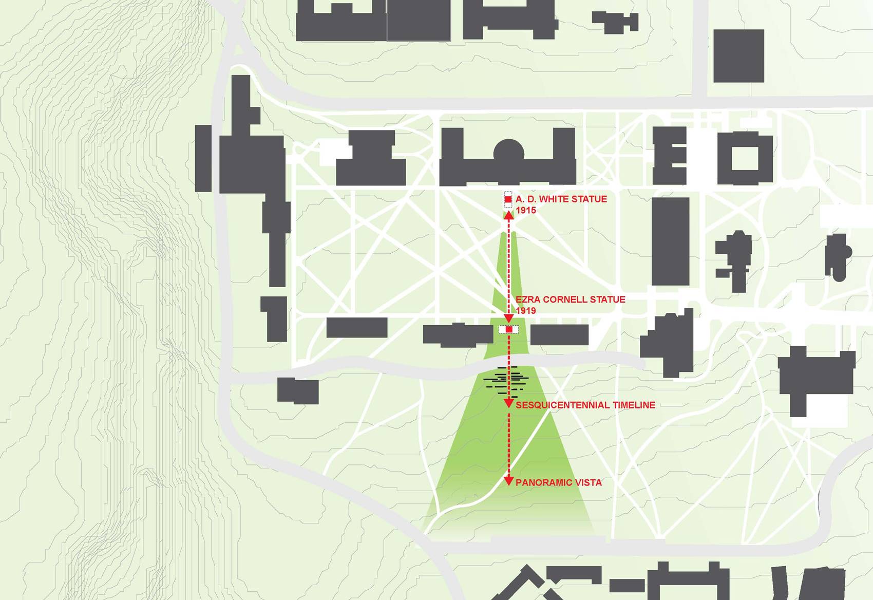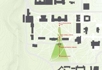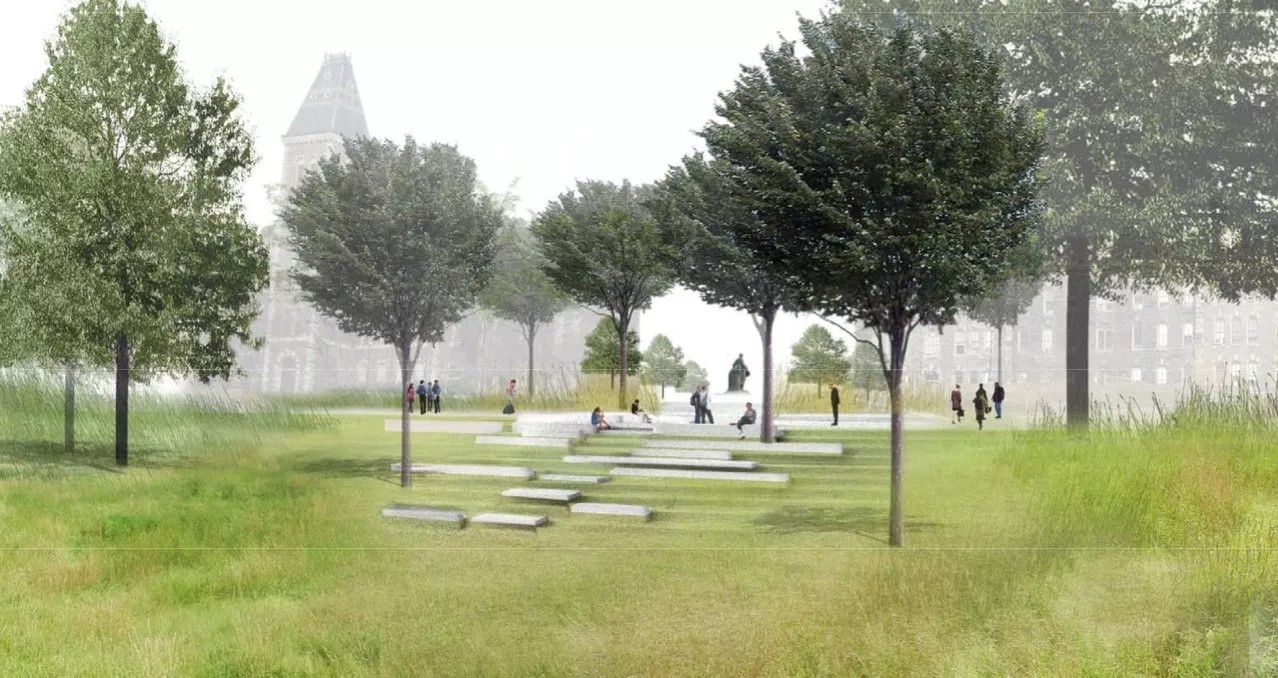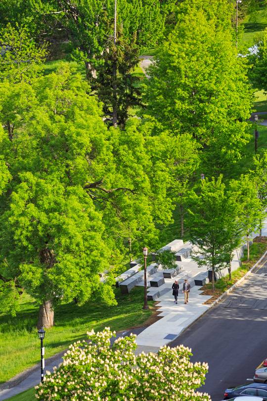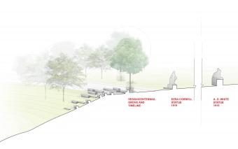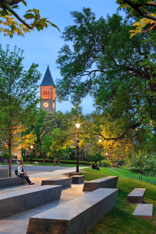 這個為150周年而設(shè)計的校園景觀位于康奈爾大學(xué)兩位創(chuàng)立者埃茲拉·康奈爾和安德魯·迪克森·懷特雕塑的延伸線上,整個空間更是沿著斜坡邊緣而建。