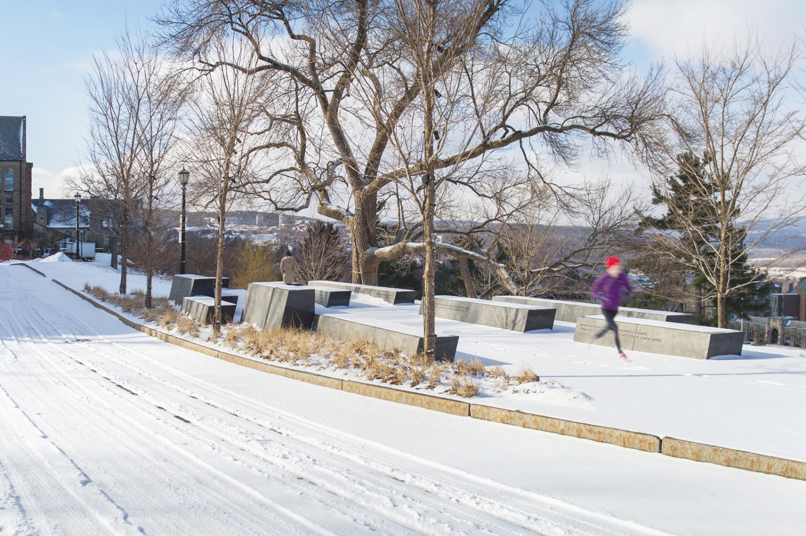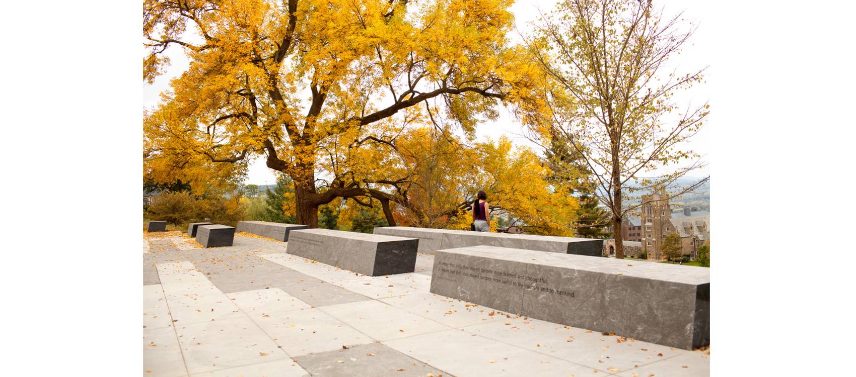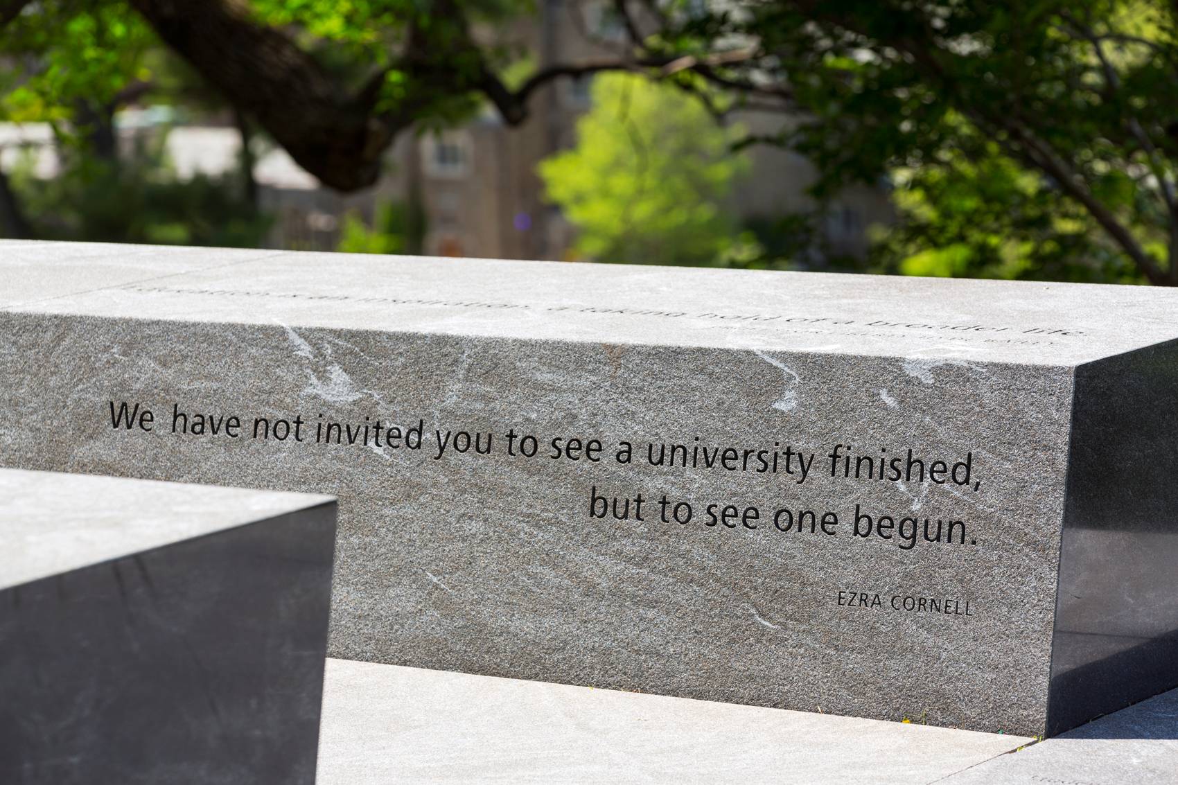 整個項目主要由45個花崗巖景觀長凳組成,坐落于康奈爾大學(xué)的榆樹林中,長凳從小廣場處一直延伸到山坡邊緣下部。這45個石登側(cè)面均雕刻著康奈爾大學(xué)150年來的輝煌歷史,希望來訪此處的人可以通過雕刻的文字了解到康奈爾大學(xué)的學(xué)術(shù)理念、歷史和創(chuàng)新,進而產(chǎn)生共鳴。