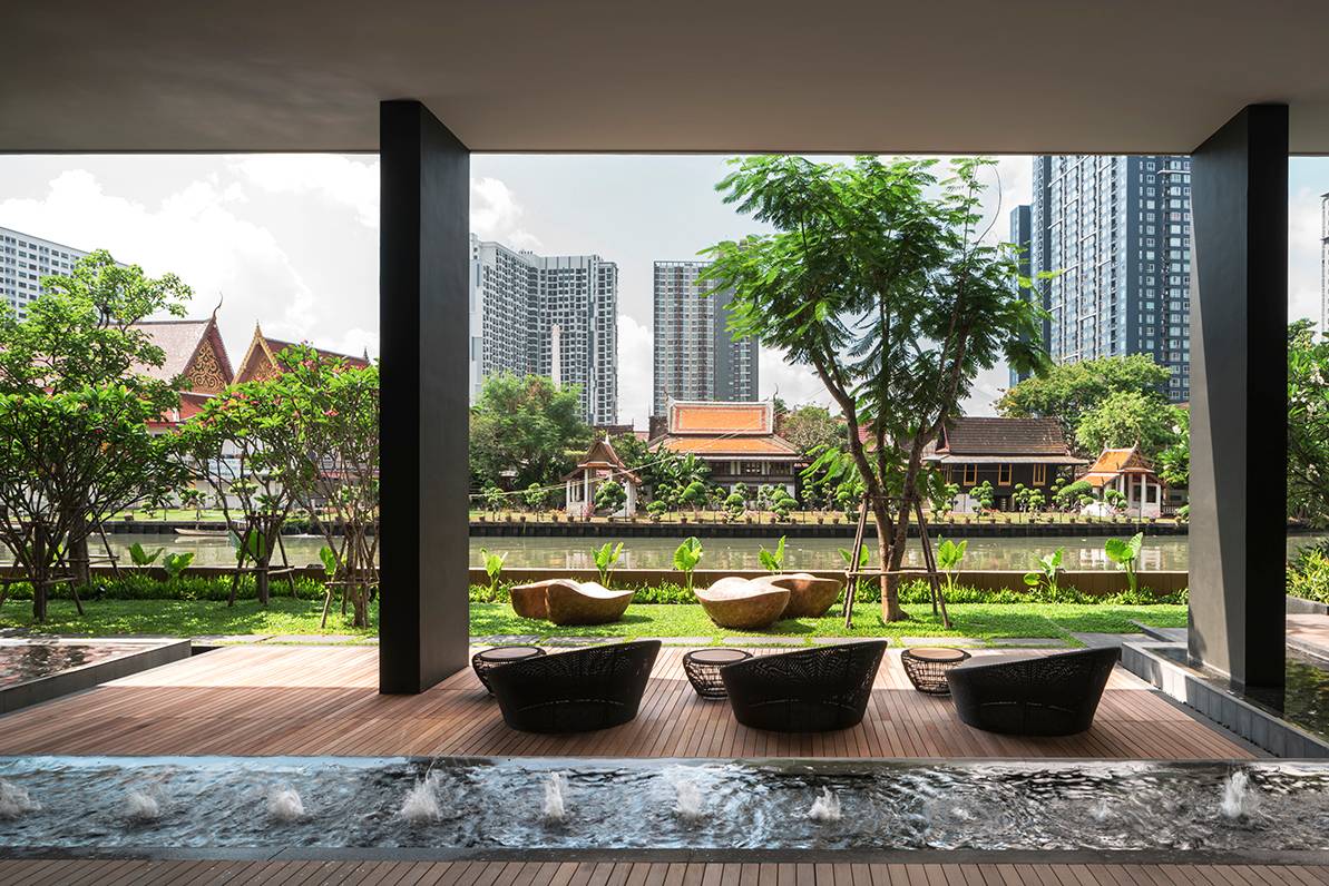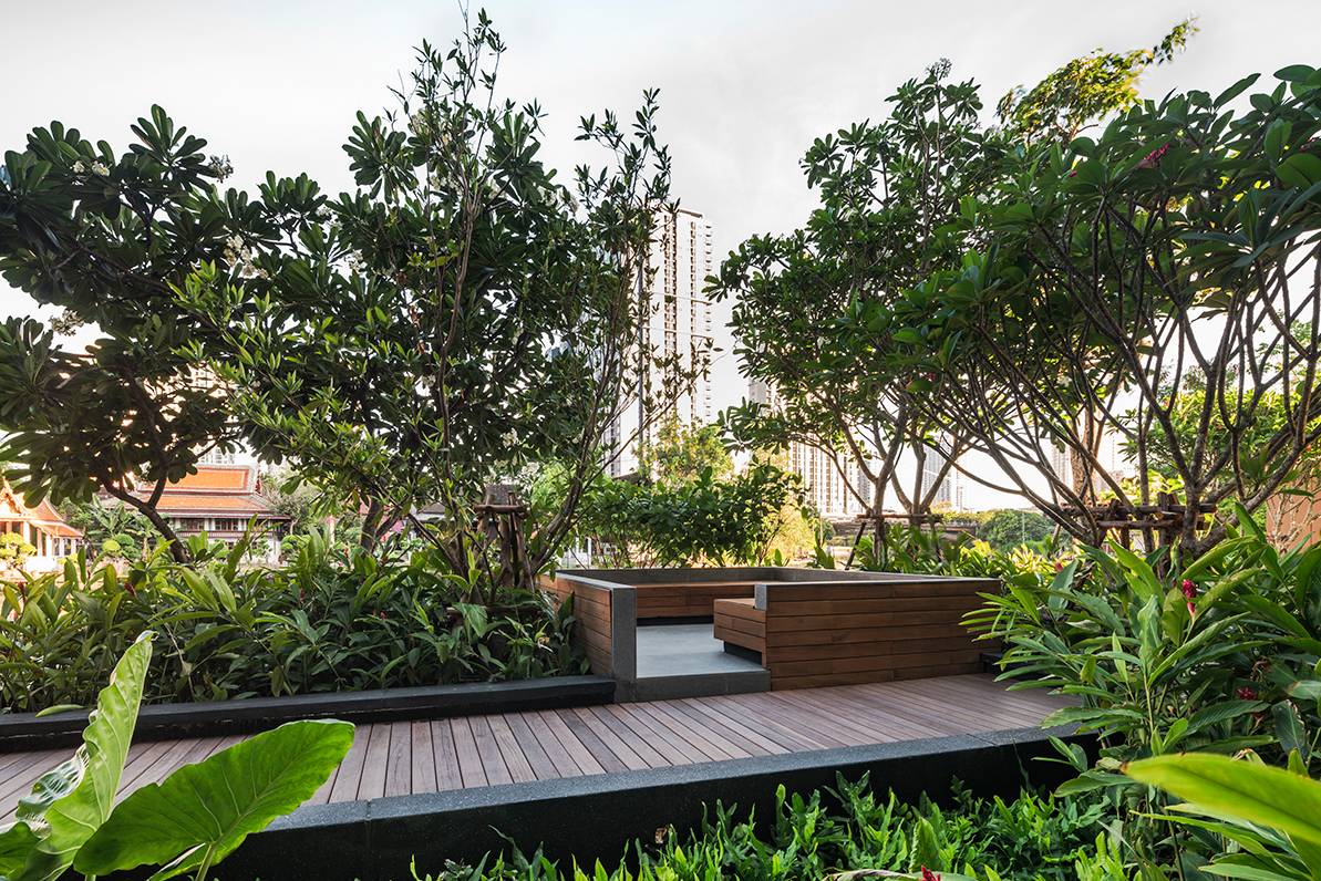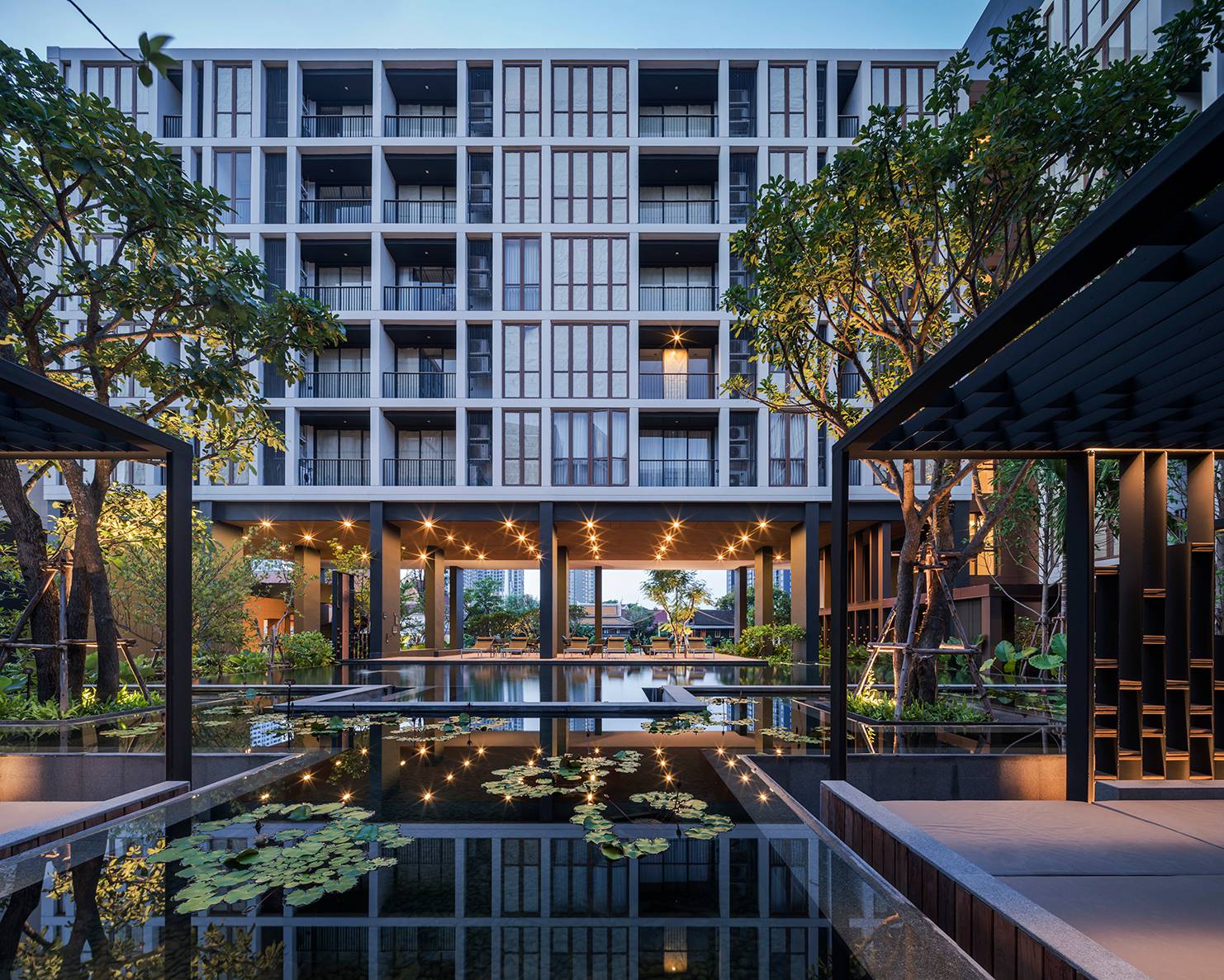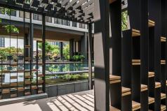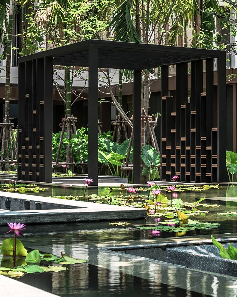 Hasu Haus是一個公寓開發(fā)項目,位于Pra Kra Nong運河邊的一個寧靜街區(qū)中。在周邊環(huán)境的映襯下,Hasu Haus景觀項目旨在體現(xiàn)“與水而居”和“慢生活”的理念。設(shè)計師試圖在整體景觀設(shè)計中詮釋“Baan Saun”(譯為“家庭花園”)的傳統(tǒng)泰式花園空間,其中采用游泳池與睡蓮池?zé)o縫連接的泰式元素。熱帶植物沿著木板踏步環(huán)繞著水上庭院進(jìn)行種植。整個庭院中還設(shè)有3個浮動的涼亭與“睡蓮池”產(chǎn)生互動。在視覺和形態(tài)上水上庭院都與室外的露臺相連,并可通達(dá)Pra Kra Nong運河旁的草坪。設(shè)計師保留了一些現(xiàn)有的樹木以體現(xiàn)空間的場地精神,同時選擇了一些新的植物品種,更好的與周圍環(huán)境相融,如玫瑰蘋果、芒果樹、杰克果,而檳榔棕櫚則沿著場地邊界種植,水上庭院內(nèi)部選用印度橡樹、檳榔棕櫚、香灰莉樹等進(jìn)行種植。
