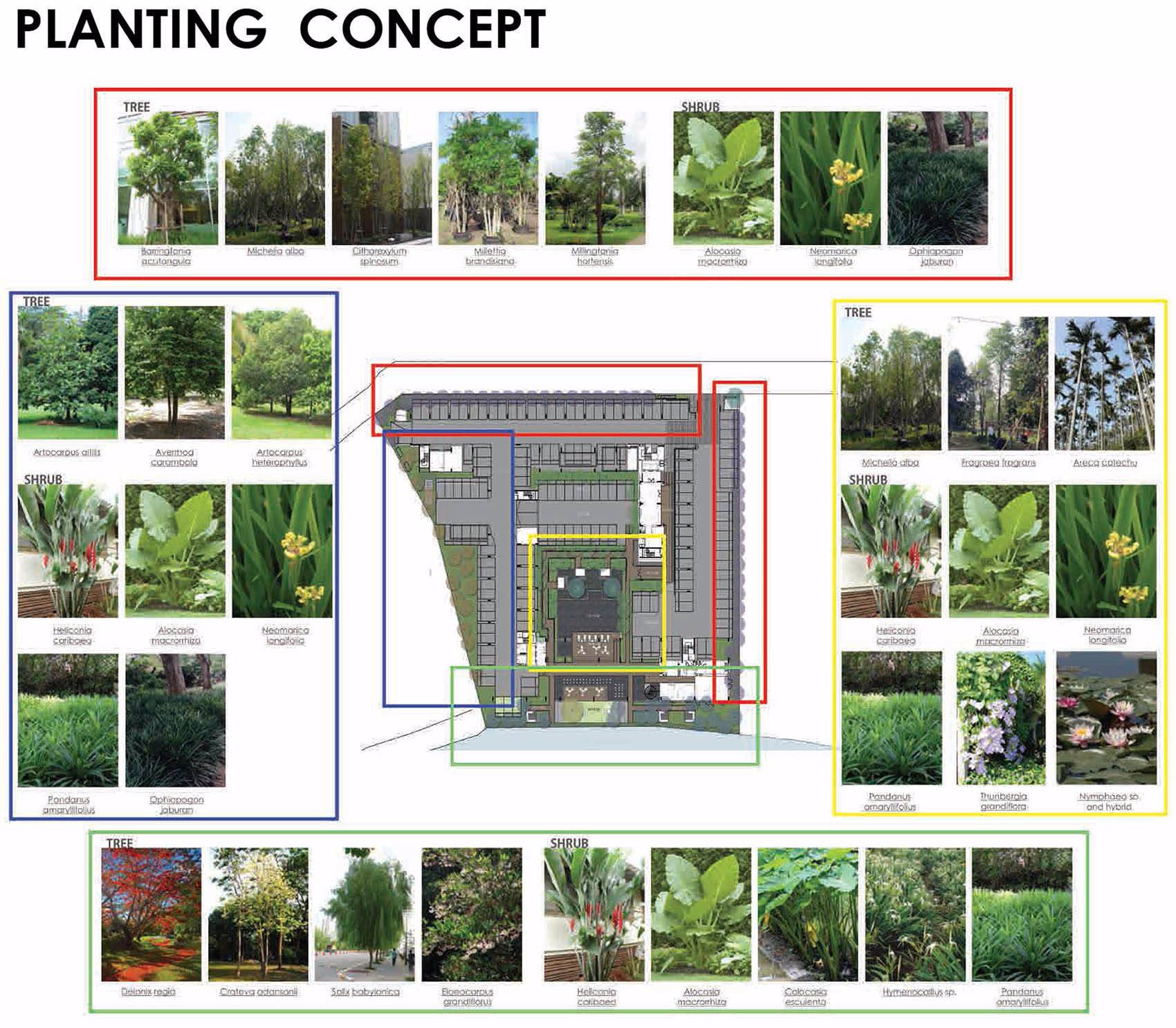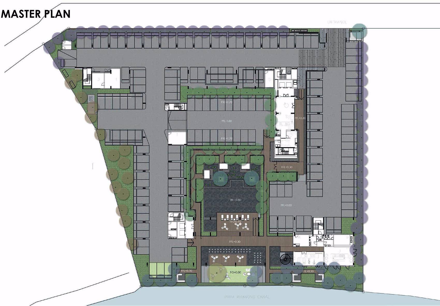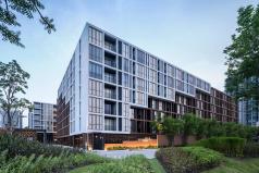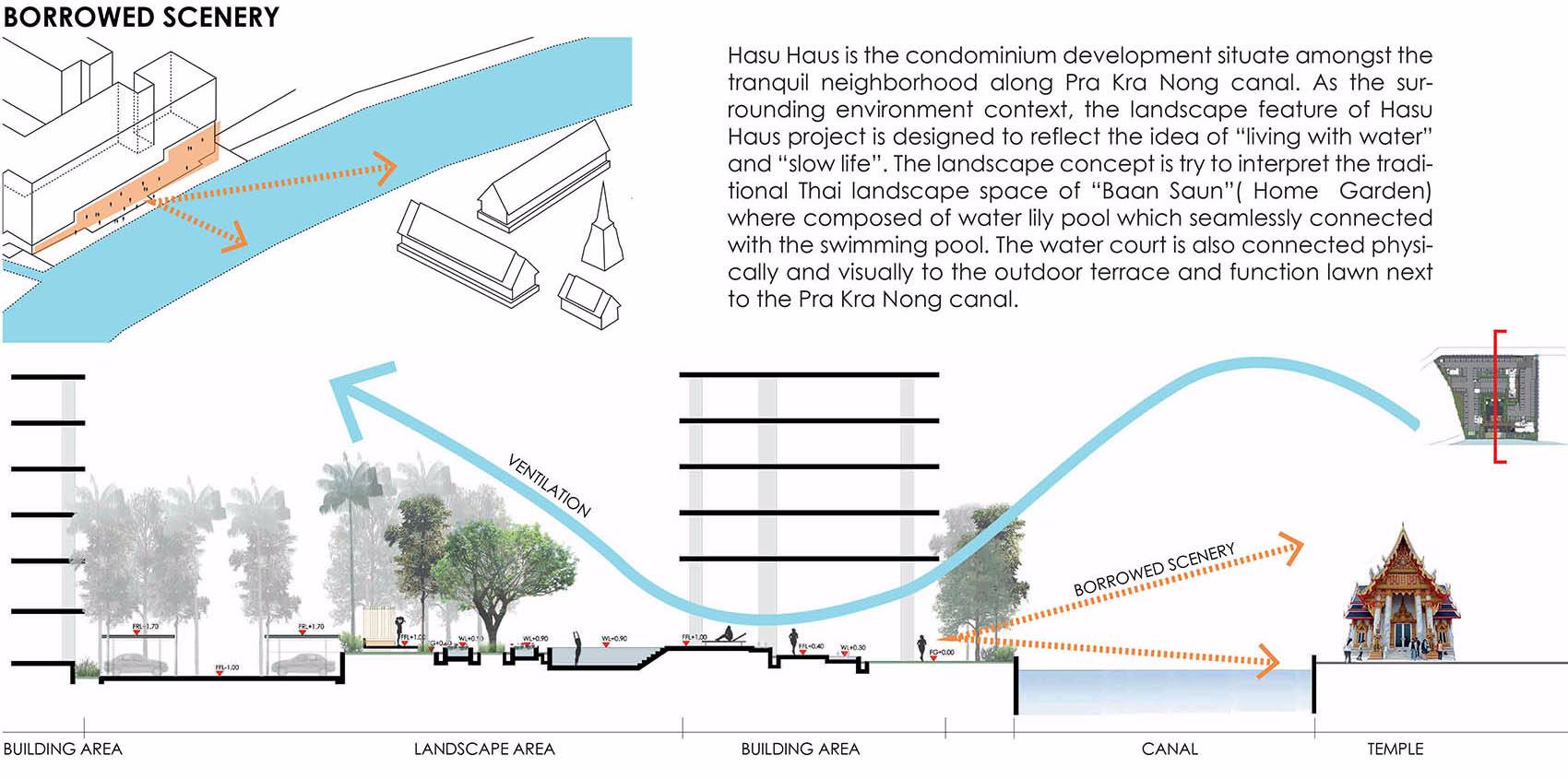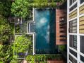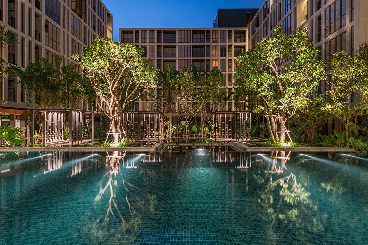 Hasu Haus是一個公寓開發(fā)項目,位于Pra Kra Nong運河邊的一個寧靜街區(qū)中。在周邊環(huán)境的映襯下,Hasu Haus景觀項目旨在體現(xiàn)“與水而居”和“慢生活”的理念。設(shè)計師試圖在整體景觀設(shè)計中詮釋“Baan Saun”(譯為“家庭花園”)的傳統(tǒng)泰式花園空間,其中采用游泳池與睡蓮池?zé)o縫連接的泰式元素。熱帶植物沿著木板踏步環(huán)繞著水上庭院進(jìn)行種植。整個庭院中還設(shè)有3個浮動的涼亭與“睡蓮池”產(chǎn)生互動。在視覺和形態(tài)上水上庭院都與室外的露臺相連,并可通達(dá)Pra Kra Nong運河旁的草坪。設(shè)計師保留了一些現(xiàn)有的樹木以體現(xiàn)空間的場地精神,同時選擇了一些新的植物品種,更好的與周圍環(huán)境相融,如玫瑰蘋果、芒果樹、杰克果,而檳榔棕櫚則沿著場地邊界種植,水上庭院內(nèi)部選用印度橡樹、檳榔棕櫚、香灰莉樹等進(jìn)行種植。