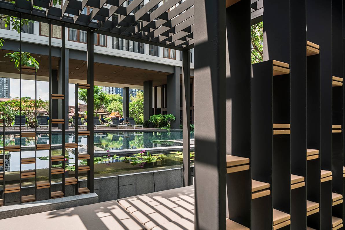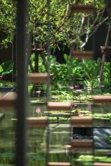 項目中的“睡蓮池”作為整個空間的核心區(qū)域,與周圍環(huán)境形成一種反射效果。水流從泳池邊緣溢出流到睡蓮池邊,這一設(shè)計營造出了寧靜的水聲效果。同時位于游泳池內(nèi)的2棵特色樹(印度橡樹)成為了整個空間的重要焦點。