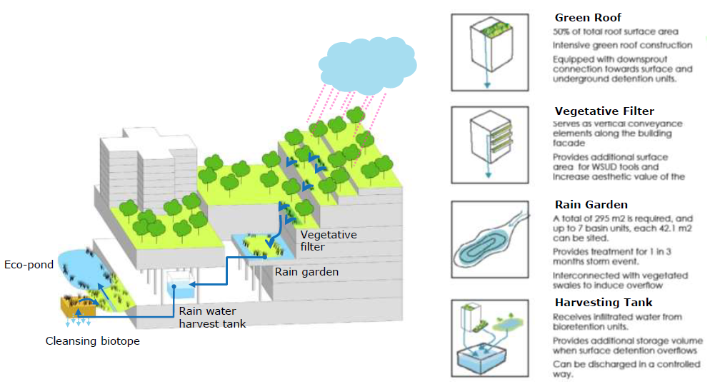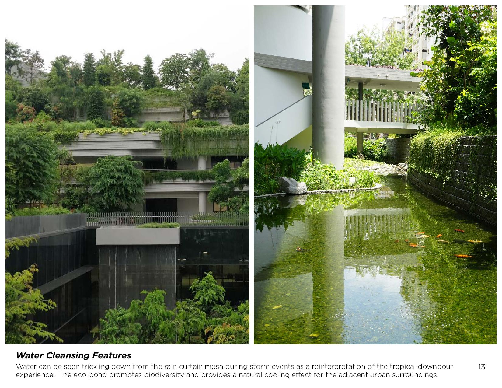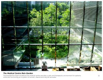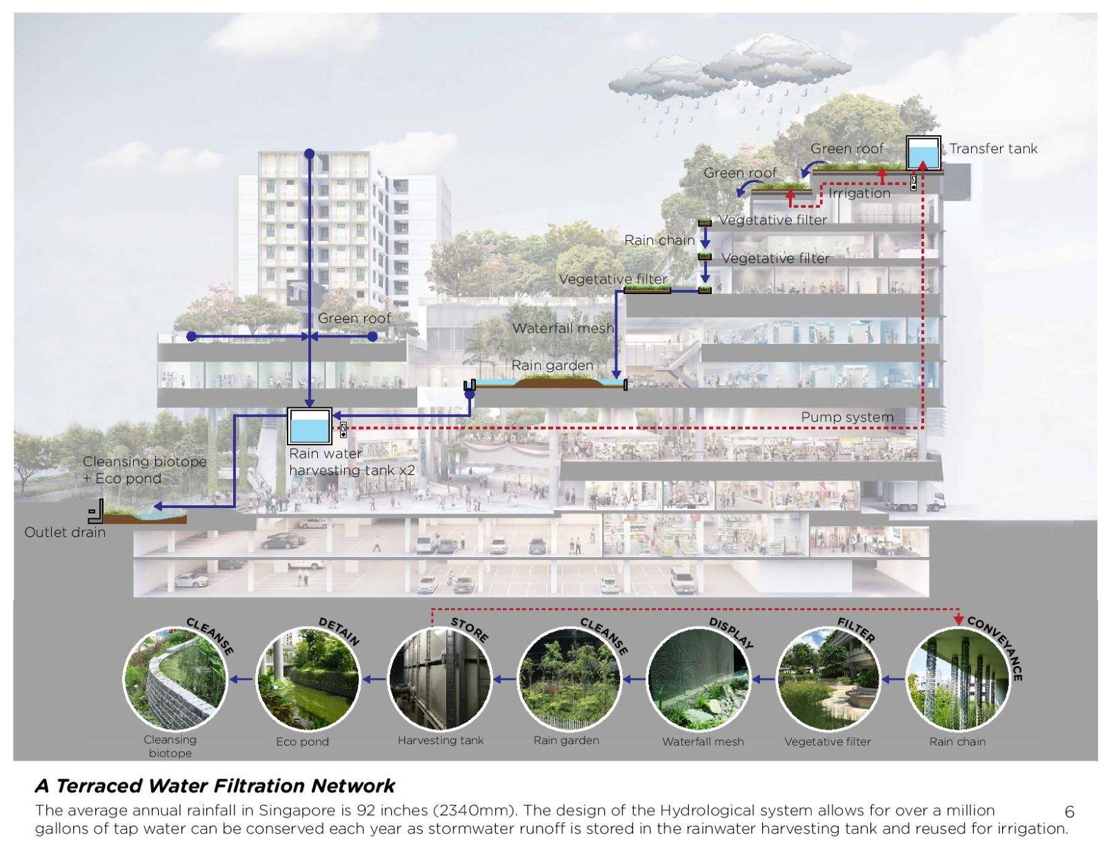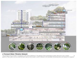 海軍部社區(qū)是城市化發(fā)展的一個(gè)很好范例,它致力于將收集,清潔和回收的雨水用于非家庭用途的灌溉和水景配置。通過水敏城市設(shè)計(jì),大部分的雨水在從建筑頂端流向下層的過程中被收集和過濾,然后重力流向中間層。過濾后的水以及來自兩個(gè)塔頂?shù)闹苯訌搅魉孔阋跃S持連續(xù)三天的植物灌溉和回補(bǔ)兩個(gè)生態(tài)池。