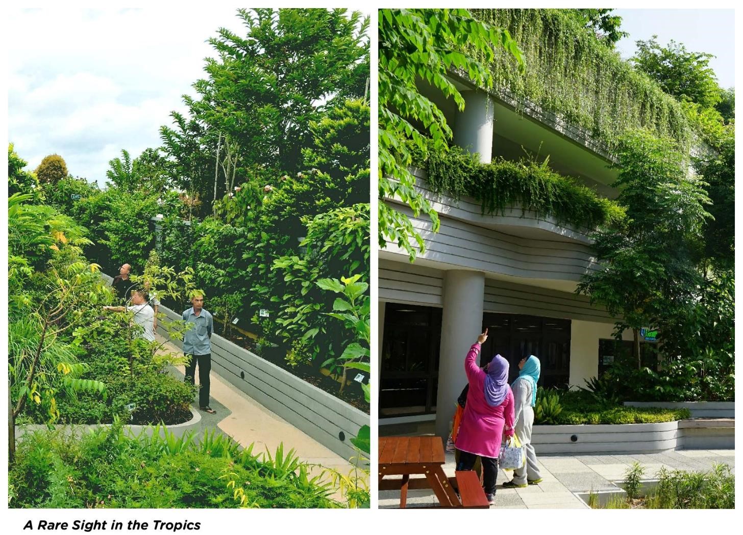 研究表明,老年人長時(shí)間與社會(huì)隔離可能會(huì)導(dǎo)致心理健康狀況不佳。海軍部社區(qū)景觀空間的設(shè)計(jì)旨在通過創(chuàng)建多樣化和充滿活力的種植方式來解決這一問題,使它作為一個(gè)充滿活力的公共環(huán)境讓人更加積極生活。在最頂層,社區(qū)花園中種植著18種曾在Kampung地區(qū)大量生長的果樹,它們時(shí)刻提醒著人們關(guān)于過去的熟悉回憶。由于在熱帶環(huán)境中很少見到色彩繽紛的季節(jié)性植物,因此不斷變化的開花、結(jié)果和變色樹葉便成功創(chuàng)造出獨(dú)特的吸引力,并成為社區(qū)之間的一個(gè)可以產(chǎn)生社會(huì)聯(lián)系的熱點(diǎn)話題。