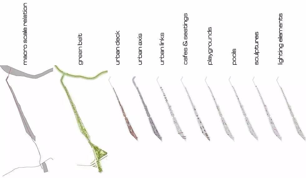 城市走廊的目的之一就是為人們提供一個有趣的環(huán)境,其中包含著適合不同年齡段的各類游樂場。除了游樂場和專為兒童設(shè)計的設(shè)施外,還設(shè)計了各種水景來讓游客感到放松。