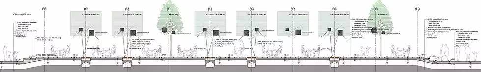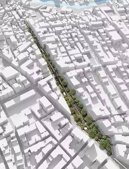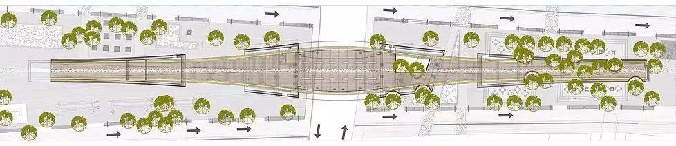 設(shè)計的原則之一是僅使用可回收的木質(zhì)材料來創(chuàng)建一個沿著軸線不間斷的城市走廊。該城市走廊不僅讓游客可以水平移動來參觀現(xiàn)有城市景觀,還提供各種與立交橋,地下通道,坡道,平臺,水池和座位區(qū)的垂直移動。