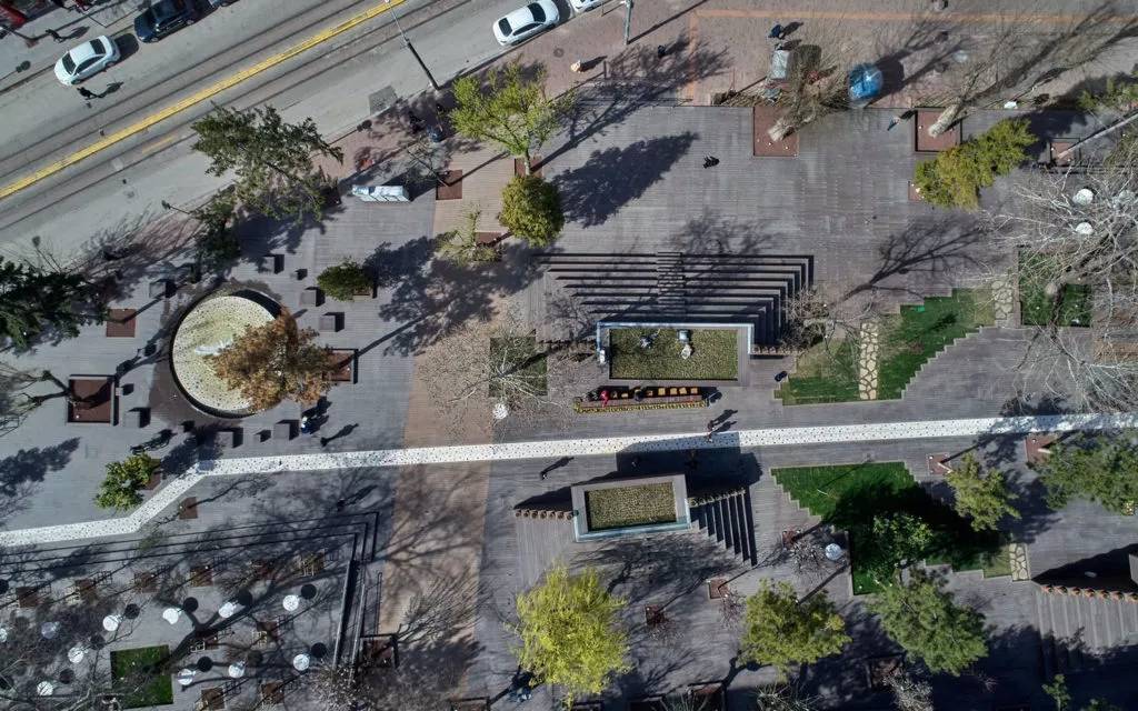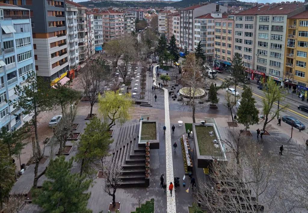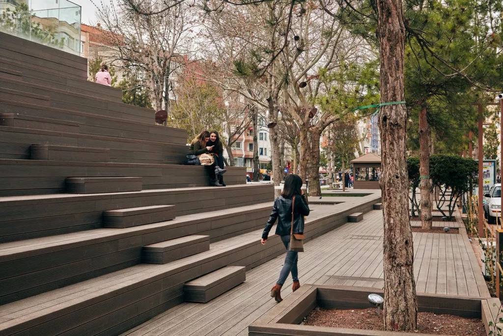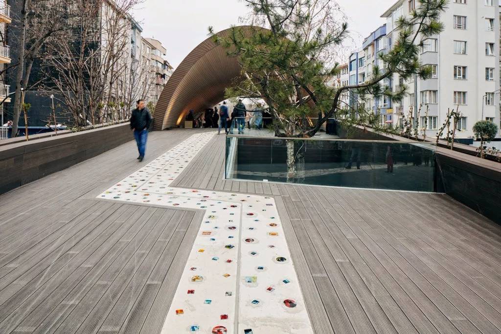 Hamamyolu 城市走廊除了保留場地原有樹木,還引進(jìn)了幾何狀的菩提樹,常春藤,灌木等其他許多綠色元素,并與Hicri Sezen公園和Alaaddin公園以及波爾蘇克河的現(xiàn)有綠色區(qū)域相連。