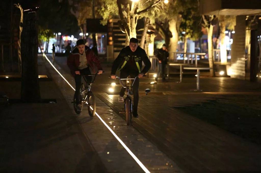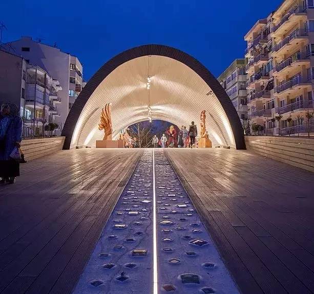 城市走廊與其周圍環(huán)境之間的關(guān)系是基于該區(qū)域現(xiàn)有城市交通路線中的步行街和道路所創(chuàng)造的。這條長1.5公里長的人行道,在地面中心嵌一條線性的LED照明。同時還有舊區(qū)生產(chǎn)的手工彩色玻璃,嵌入到白水泥之中。
