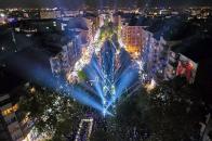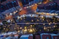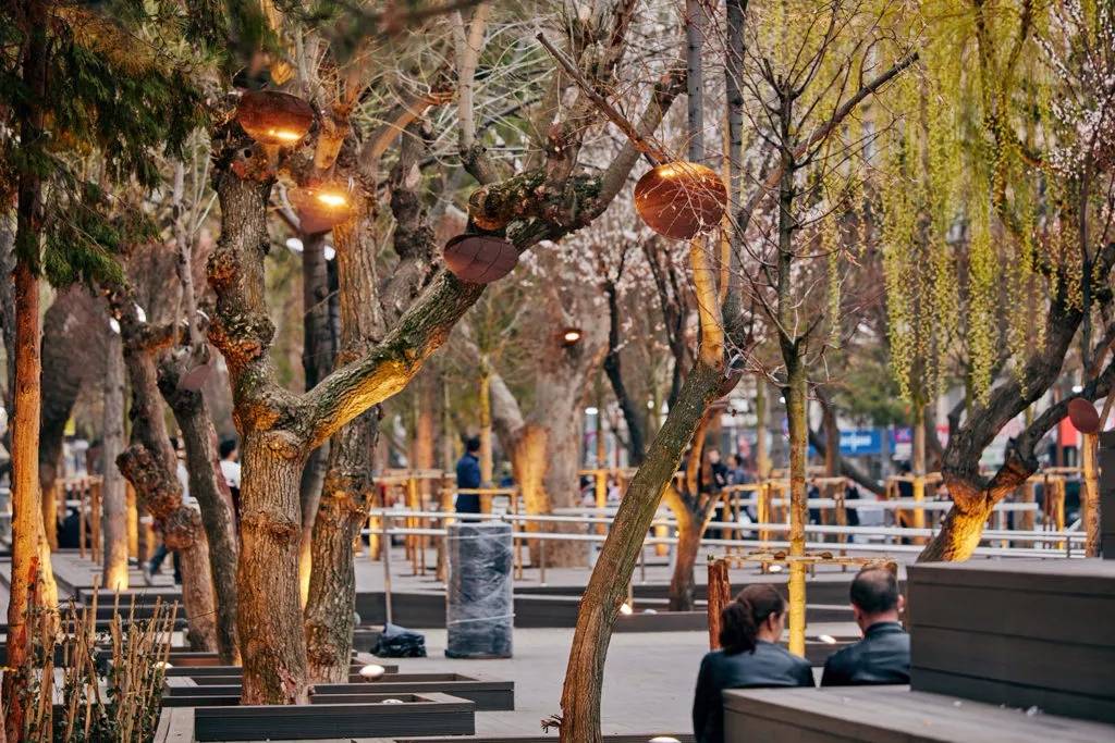 照明元素成為該城市走廊設(shè)計的亮點(diǎn)。樹木中安置青銅不銹鋼板,以映襯位于基地的聚光燈燈光。此外,停車場和購物街的路燈也被專門設(shè)計。