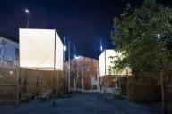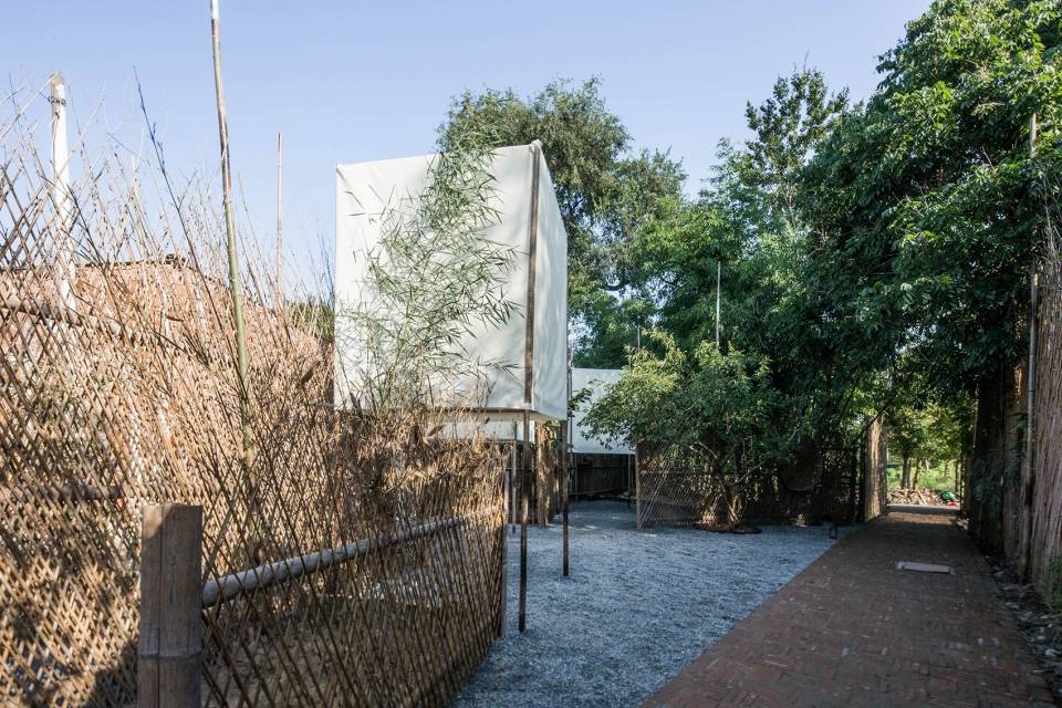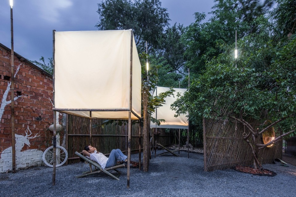 觀星盒子是利用竹子作為基礎(chǔ)框架,在框架外裝置圍合材料。圍合材料的選擇上,設(shè)計(jì)師提出了四點(diǎn)要求:1.有一定的透光型:能夠透出內(nèi)置的燈帶光,在視覺(jué)上能形成漂浮燈籠的感受,增加夜晚浪漫靜謐的氛圍;2.易加工:在成本和人力都相對(duì)缺乏的情況下,容易加工并且出效果;3.景觀性:材料本身需要一定質(zhì)感,提升空間的品質(zhì);4.耐久性。在多方的考慮下,設(shè)計(jì)團(tuán)隊(duì)選擇了半透光的無(wú)紡窗簾布。該布料有質(zhì)感,能形成隱約透光的效果,易加工,并且具備較好的耐久性。