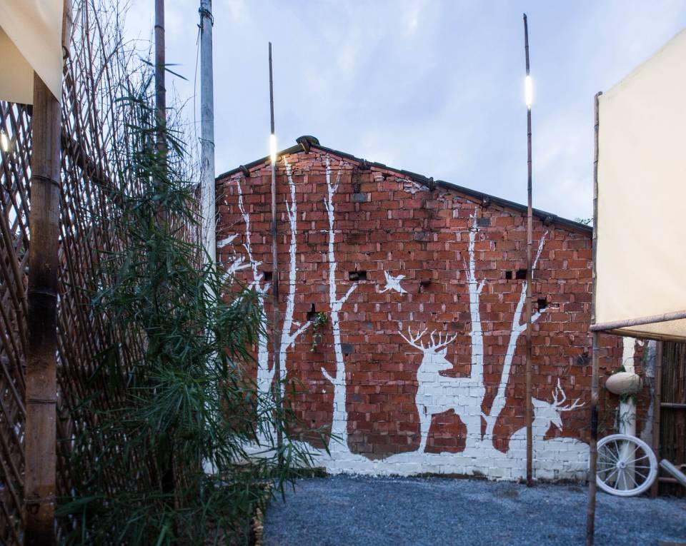 設(shè)計(jì)師在民宿紅磚墻上,繪上母子鹿的墻繪,增加院落整體視覺(jué)趣味性。