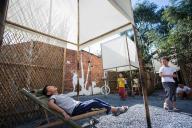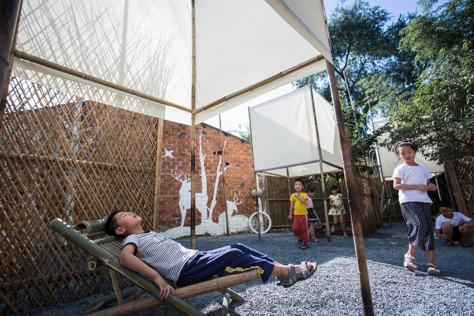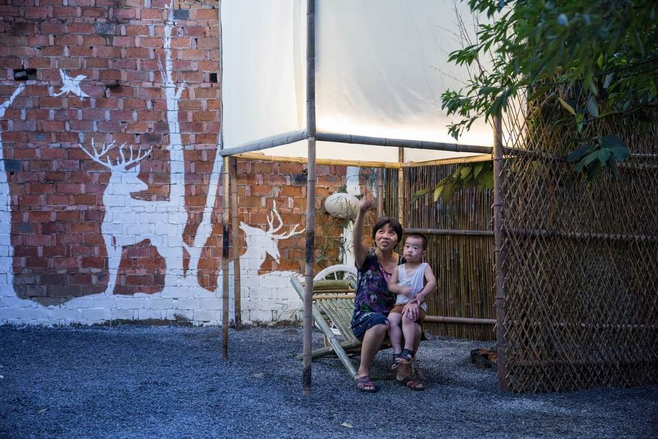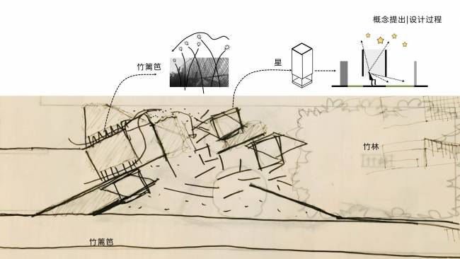 場(chǎng)地位于民宿的北側(cè),面積約有220多平米,進(jìn)深7米。這是一個(gè)稀松平常的鄉(xiāng)村角落。從后院到河邊道路中間有一片17米進(jìn)深的荒地,荒地旁是一小片竹林。實(shí)地考察后,橫港鄉(xiāng)建營(yíng)暨奧雅集訓(xùn)營(yíng)的設(shè)計(jì)學(xué)生決定將院落、荒地以及竹林打通,整合設(shè)計(jì)。在整合的空間中,進(jìn)一步安排,增加折線形的分割墻,創(chuàng)造更加交互的流動(dòng)空間。同時(shí),分隔墻將院子劃分成兩部分,開(kāi)放的公共庭院和內(nèi)部的私密空間,滿足住客多維度的需求。設(shè)計(jì)師還在院中設(shè)計(jì)了觀星盒子,增添場(chǎng)地的趣味性。人們可以躺在觀星盒子竹椅上,仰望夜空,沉浸在這種“藝術(shù)介入鄉(xiāng)村”的體驗(yàn)中。