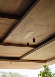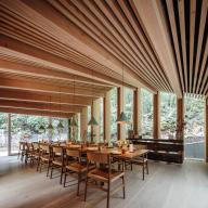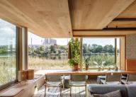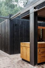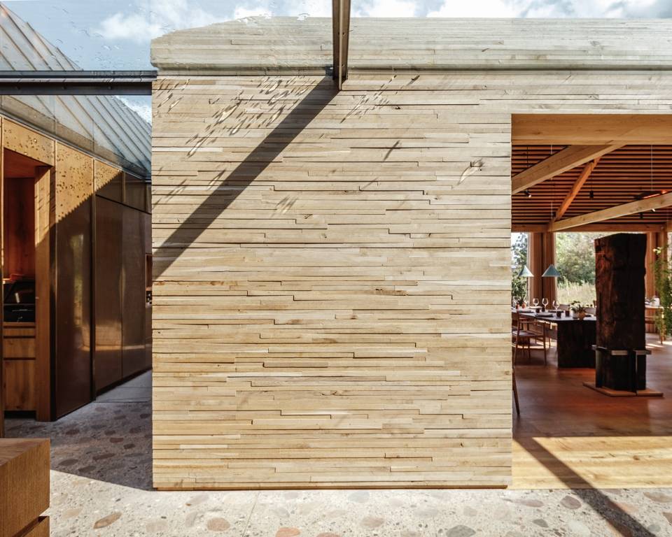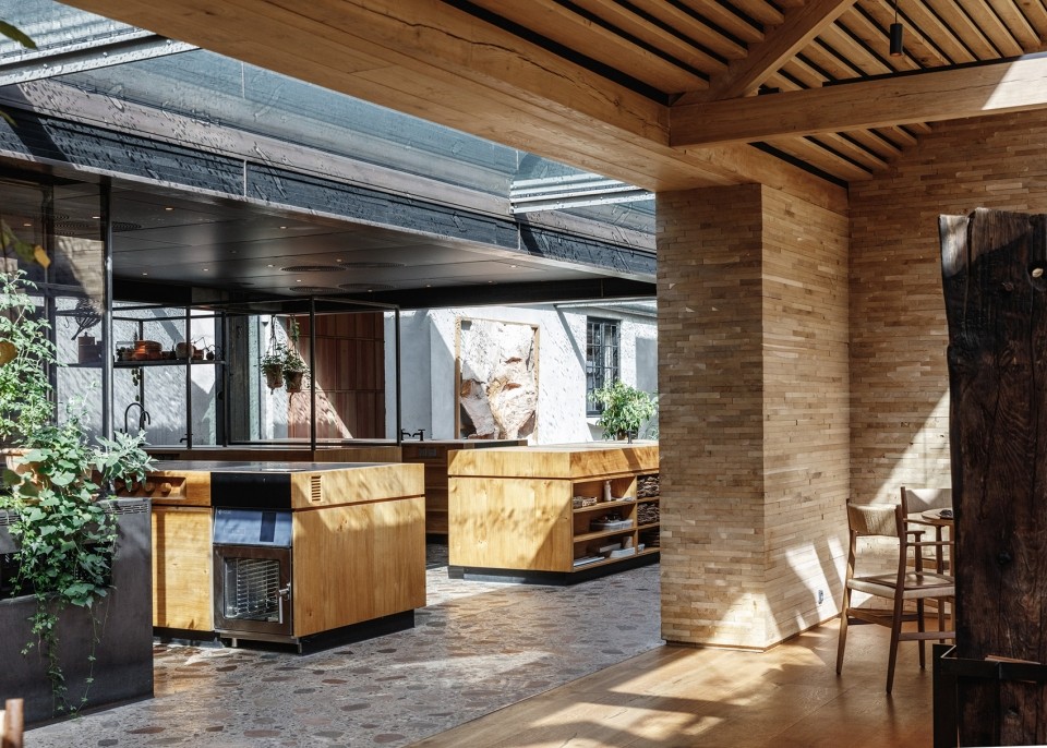 廚房是一個(gè)開放式的空間,操作臺(tái)的上方是巨大的懸吊式屋頂。廚師們可以從這里看到整個(gè)廚房和客人區(qū),包括用餐區(qū)和與之相鄰的私人餐室。這一系列空間由層疊的木板構(gòu)成,看上去如同木材場(chǎng)堆放整齊的木料。