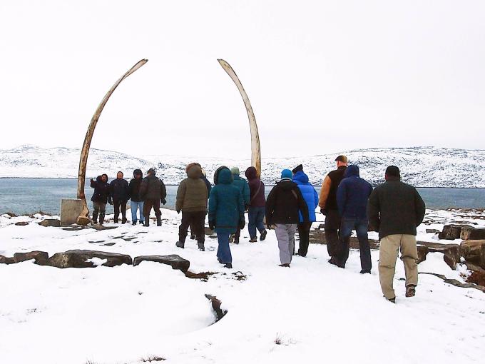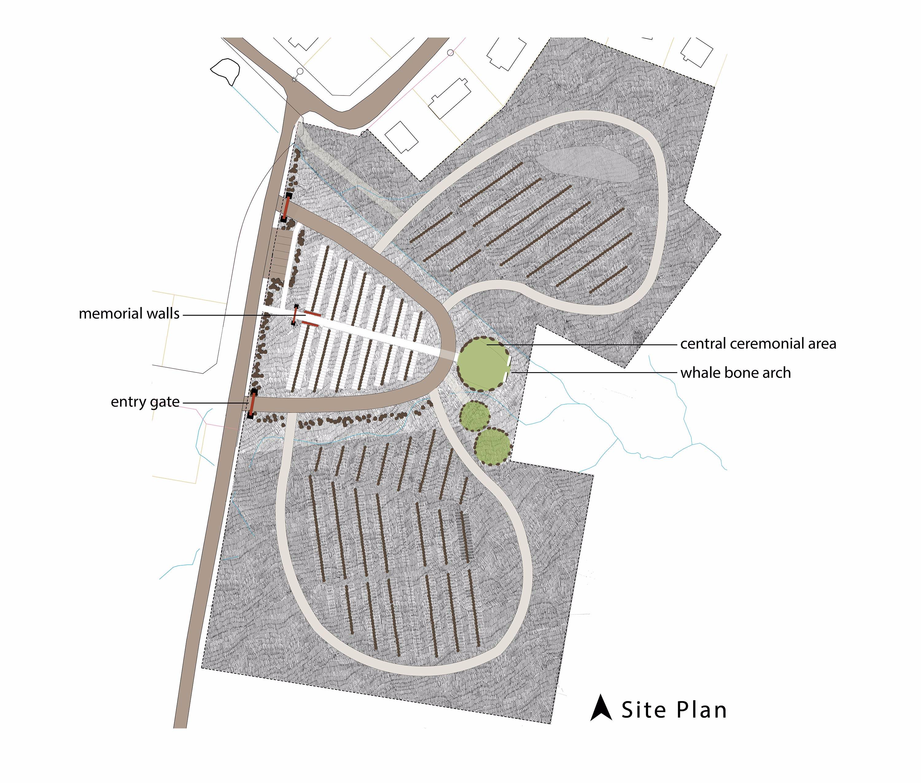 公墓內以步行交通為主,訪問者通過主路到達儀式聚會區(qū),主路盡頭是北極弓頭鯨下顎骨做成的拱門。公墓中心區(qū)巨大的鯨魚骨拱門仿佛將大海的景色錨定在畫框中,象征著與亡靈世界的連接,同時也表達了對族群中獵人的尊重。